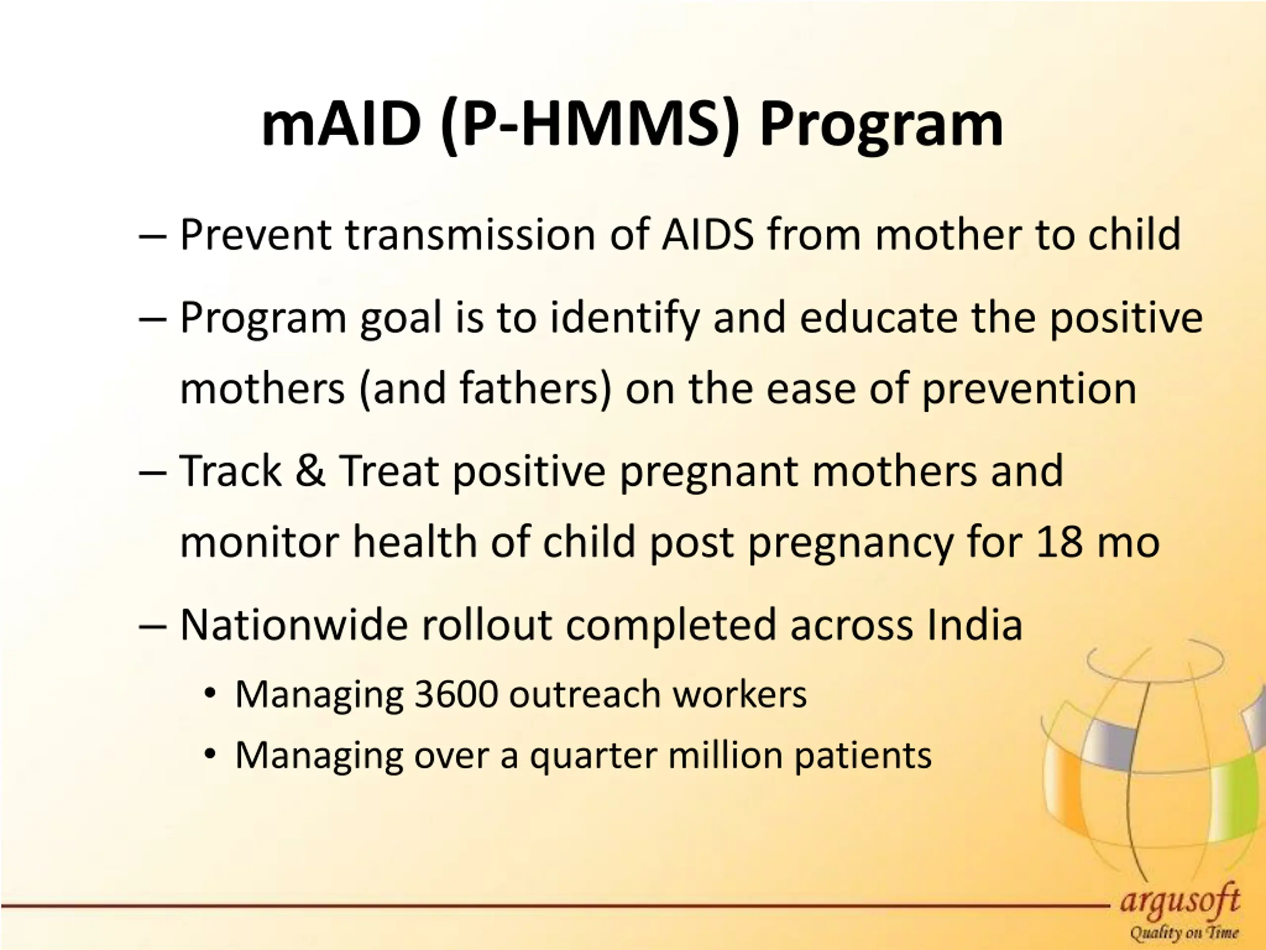 mAID (P-HMMS) Program Prevent transmission of AIDS from mother to child Program goal is to identify and educate the positive mothers (and fathers) on the ease of prevention Track & Treat positive pregnant mothers and monitor health of child post pregnancy for 18 mo Nationwide rollout completed across India Managing 3600 outreach workers Managing over a quarter million patients