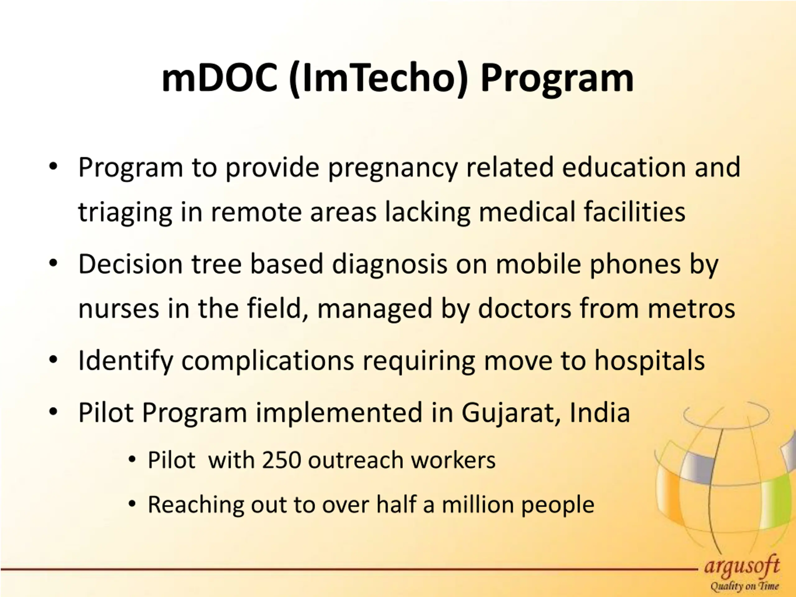 mDOC (ImTecho) Program Program to provide pregnancy related education and triaging in remote areas lacking medical facilities Decision tree based diagnosis on mobile phones by nurses in the field, managed by doctors from metros Identify complications requiring move to hospitals Pilot Program implemented in Gujarat, India Pilot with 250 outreach workers Reaching out to over half a million people