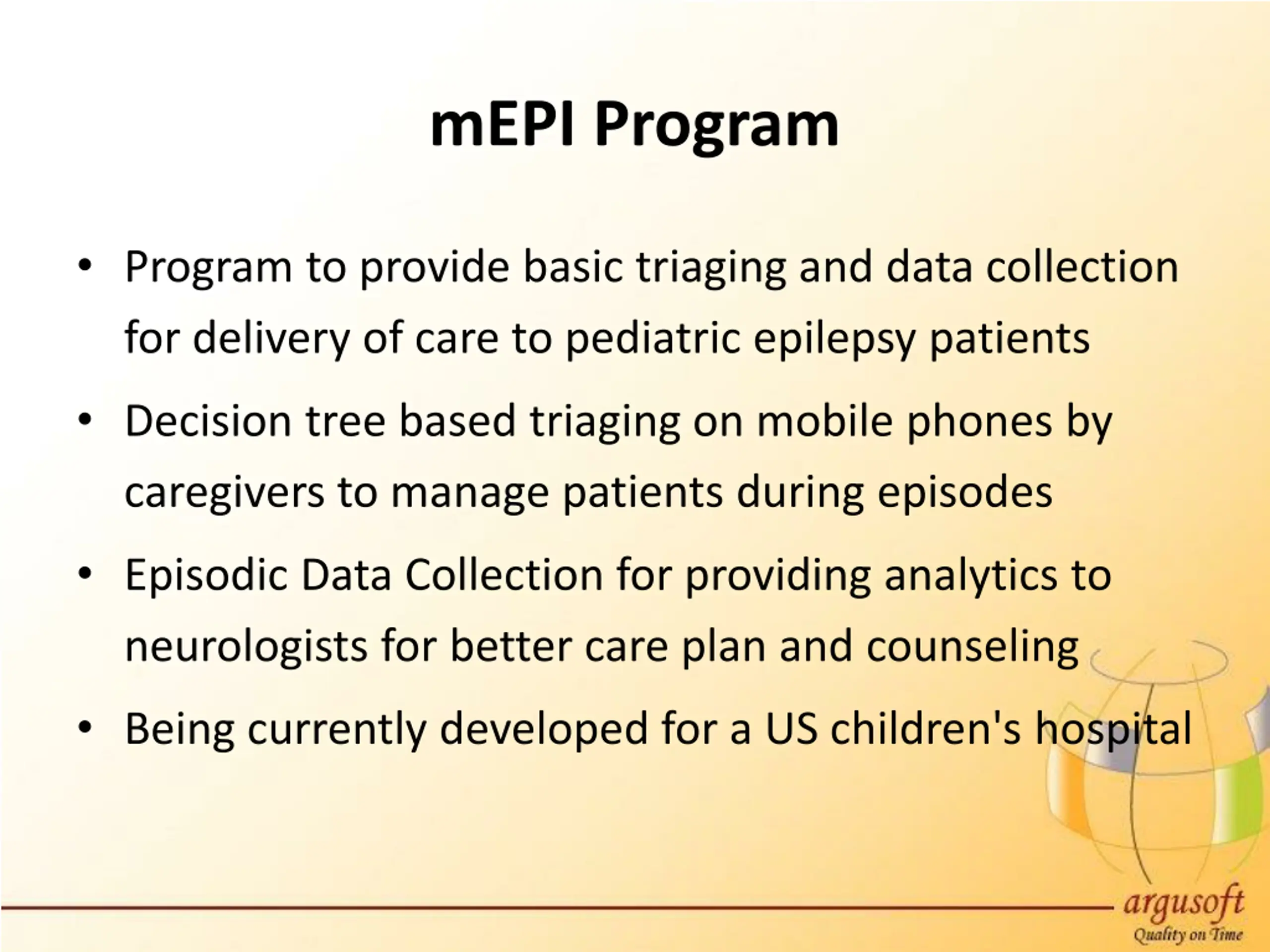 mEPI Program Program to provide basic triaging and data collection for delivery of care to pediatric epilepsy patients Decision tree based triaging on mobile phones by caregivers to manage patients during episodes Episodic Data Collection for providing analytics to neurologists for better care plan and counseling Being currently developed for a US children's hospital