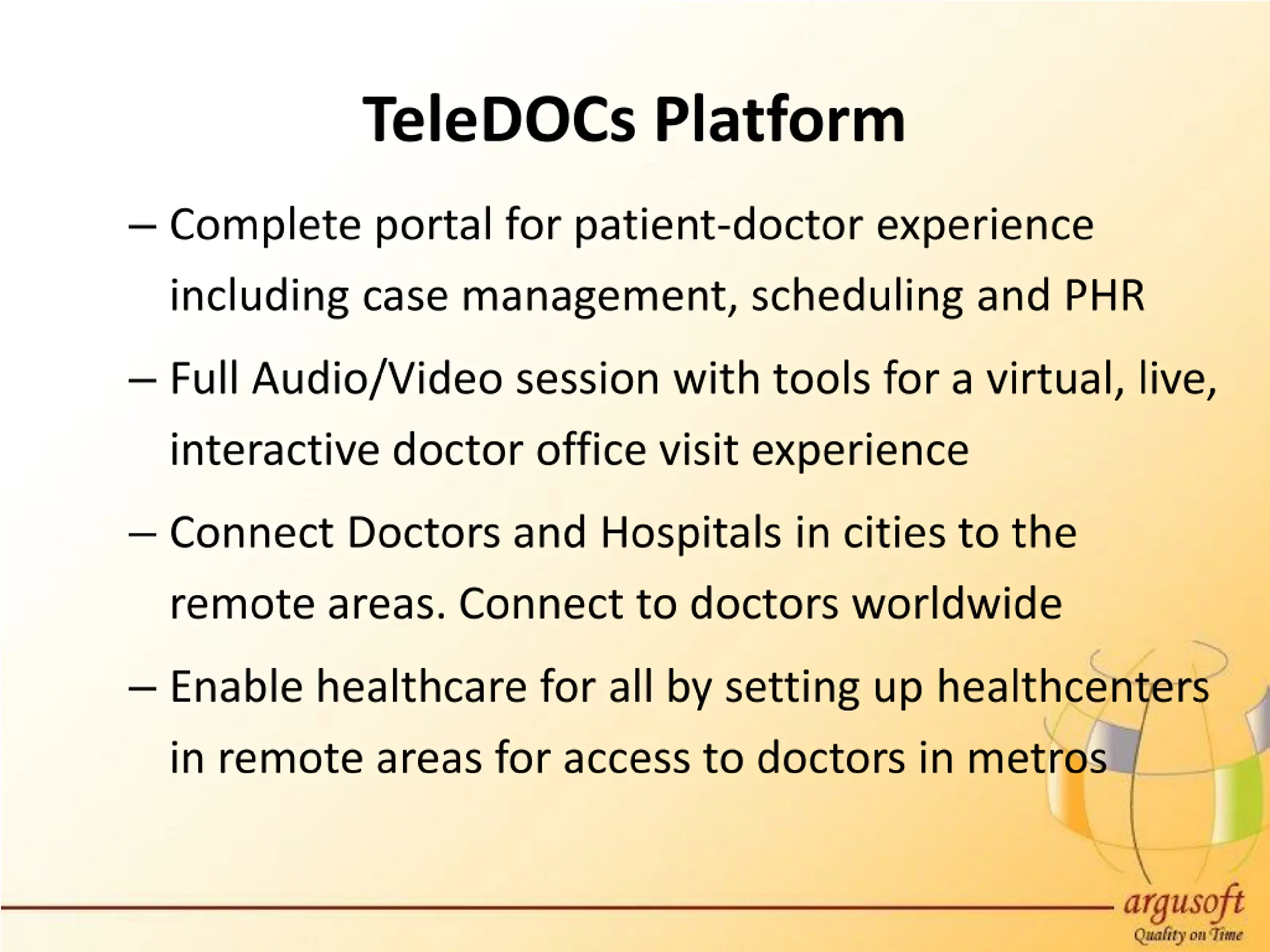 TeleDOCs Platform Complete portal for patient-doctor experience including case management, scheduling and PHR Full Audio/Video session with tools for a virtual, live, interactive doctor office visit experience Connect Doctors and Hospitals in cities to the remote areas. Connect to doctors worldwide Enable healthcare for all by setting up healthcenters in remote areas for access to doctors in metros