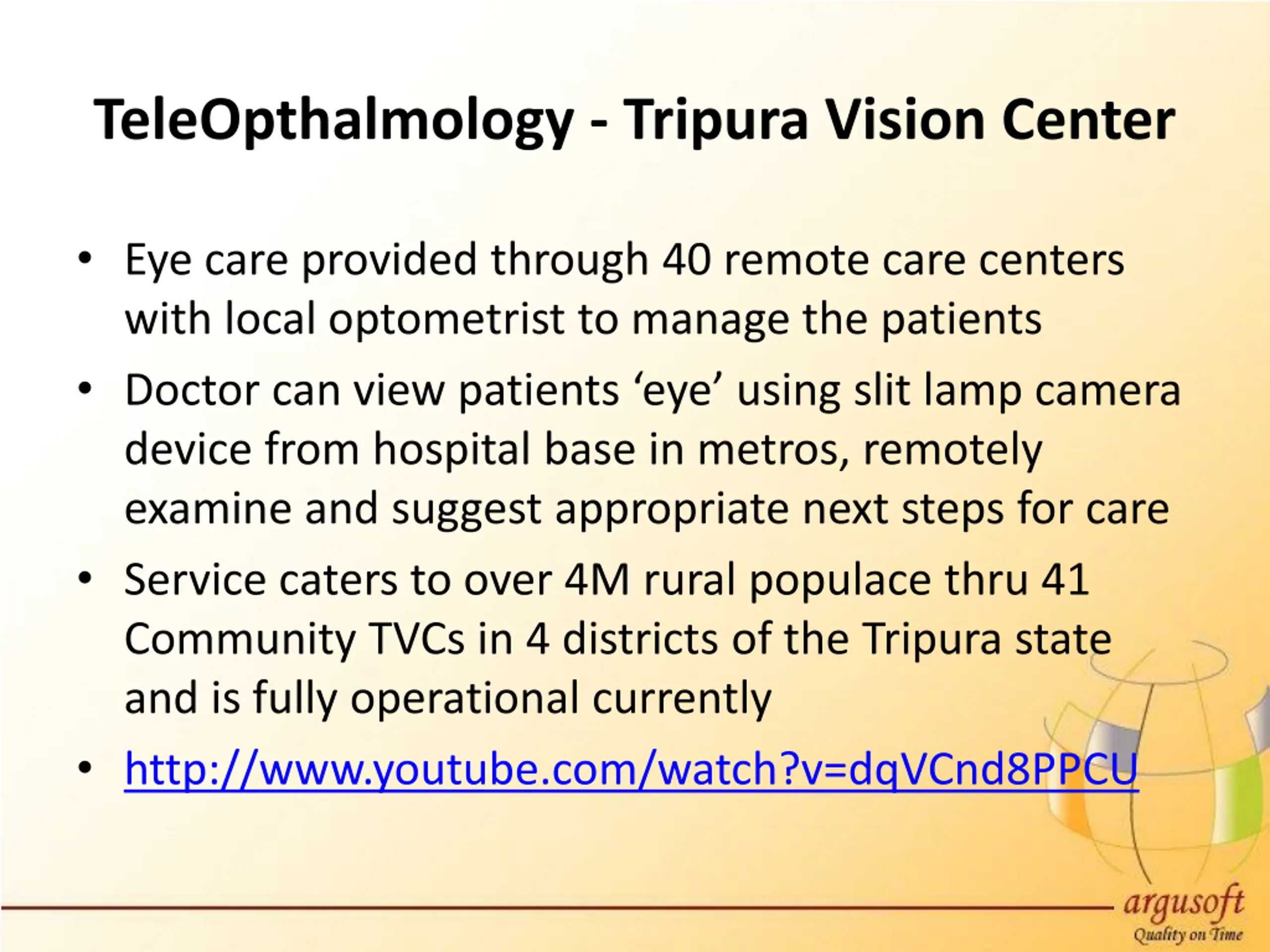 TeleOpthalmology - Tripura Vision Center Eye care provided through 40 remote care centers with local optometrist to manage the patients Doctor can view patients eye using slit lamp camera device from hospital base in metros, remotely examine and suggest appropriate next steps for care Service caters to over 4M rural populace thru 41 Community TVCs in 4 districts of the Tripura state and is fully operational currently http://www.youtube.com/watch?v=dqVCnd8PPCU