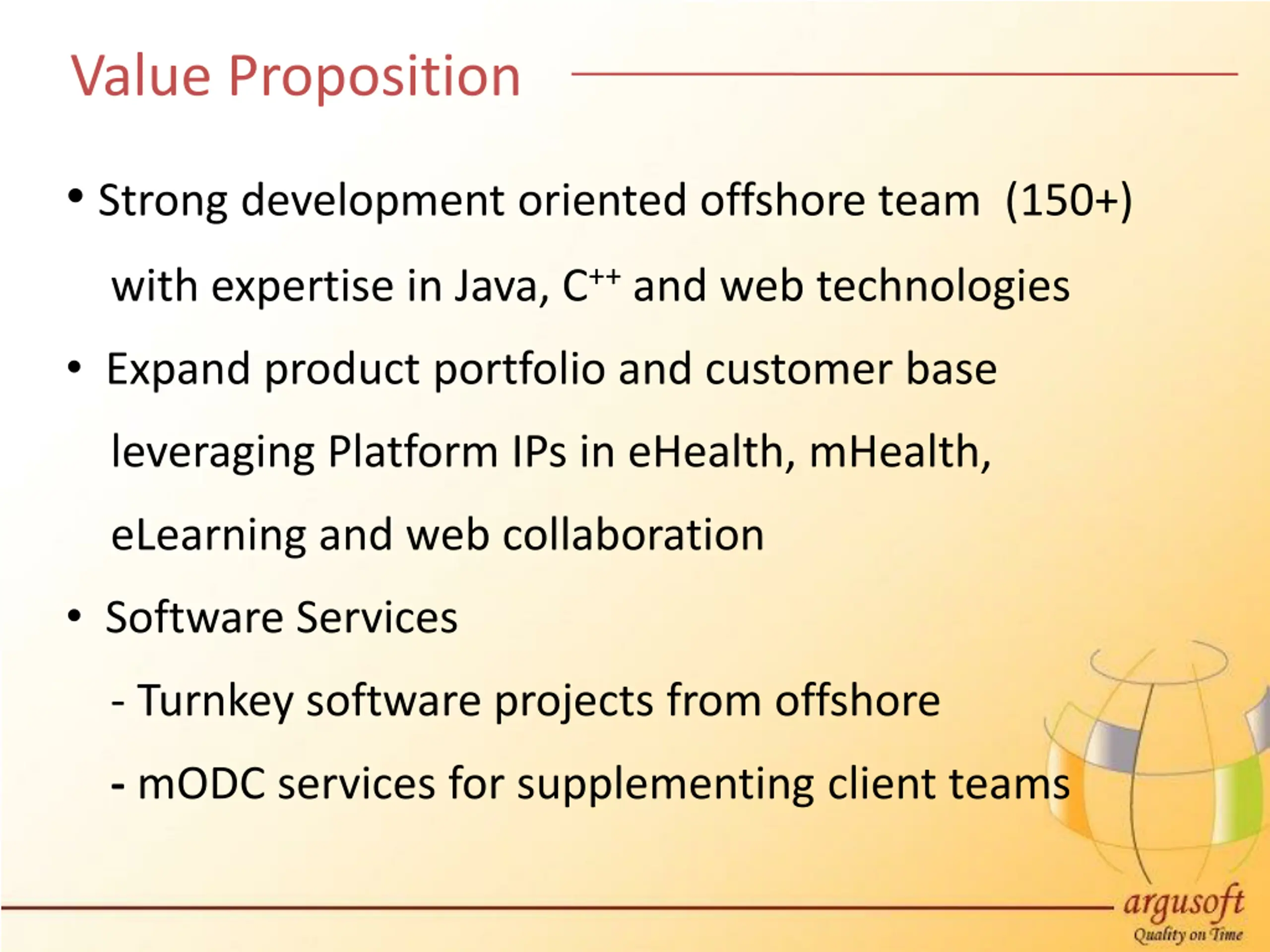 Value Proposition Strong development oriented offshore team (150+) with expertise in Java, C++ and web technologies Expand product portfolio and customer base leveraging Platform IPs in eHealth, mHealth, eLearning and web collaboration Software Services - Turnkey software projects from offshore - mODC services for supplementing client teams
