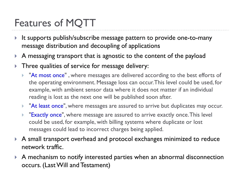 Features of MQTT It supports publish/subscribe message pattern to provide one-to-many message distribution and decoupling of applications A messaging transport that is agnostic to the content of the payload Three qualities of service for message delivery: "At most once" , where messages are delivered according to the best efforts of the operating environment. Message loss can occur. This level could be used, for example, with ambient sensor data where it does not matter if an individual reading is lost as the next one will be published soon after. "At least once", where messages are assured to arrive but duplicates may occur. "Exactly once", where message are assured to arrive exactly once. This level could be used, for example, with billing systems where duplicate or lost messages could lead to incorrect charges being applied. A small transport overhead and protocol exchanges minimized to reduce network traffic. A mechanism to notify interested parties when an abnormal disconnection occurs. (Last Will and Testament)