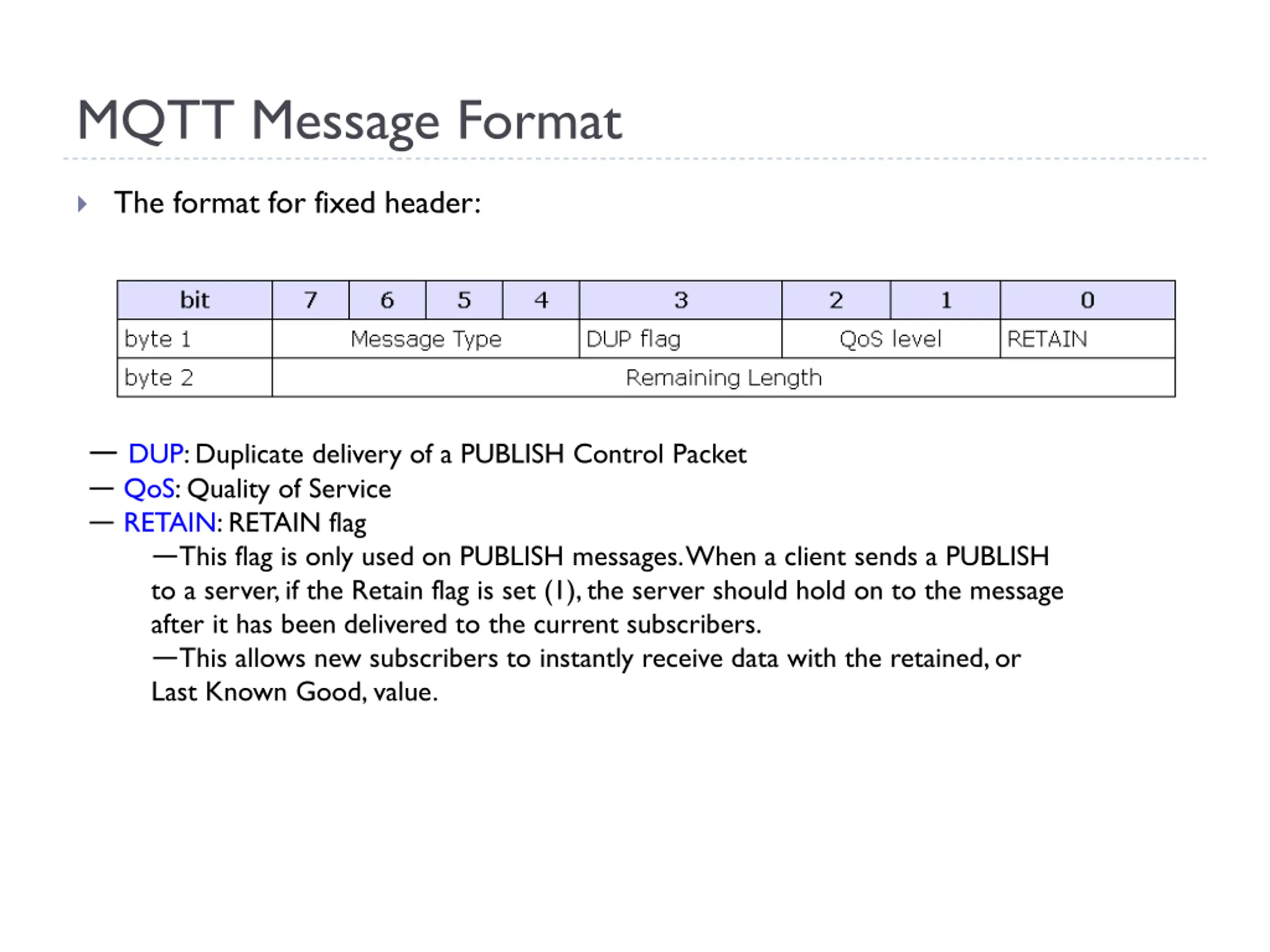 MQTT Message Format The format for fixed header: DUP: Duplicate delivery of a PUBLISH Control Packet QoS: Quality of Service RETAIN: RETAIN flag This flag is only used on PUBLISH messages. When a client sends a PUBLISH to a server, if the Retain flag is set (1), the server should hold on to the message after it has been delivered to the current subscribers. This allows new subscribers to instantly receive data with the retained, or Last Known Good, value.