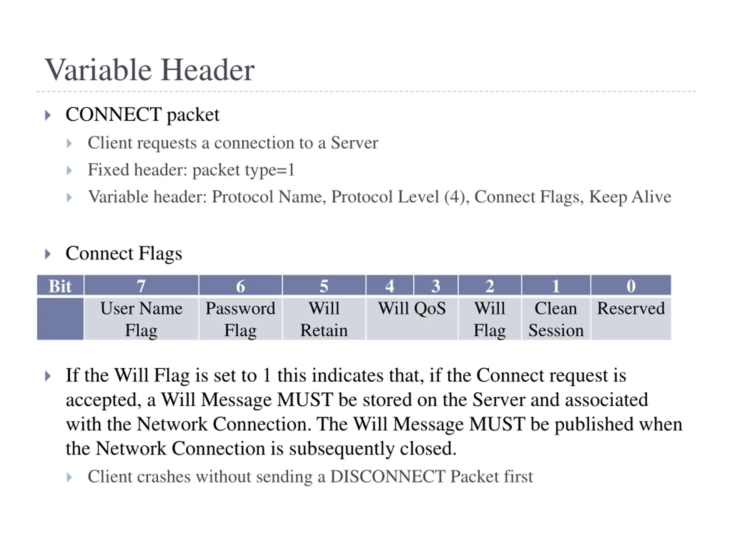Variable Header CONNECT packet Client requests a connection to a Server Fixed header: packet type=1 Variable header: Protocol Name, Protocol Level (4), Connect Flags, Keep Alive Connect Flags Bit 7 6 5 4 3 2 1 0 User Name Flag Password Flag Will Retain Will QoS Will Flag Clean Session Reserved If the Will Flag is set to 1 this indicates that, if the Connect request is accepted, a Will Message MUST be stored on the Server and associated with the Network Connection. The Will Message MUST be published when the Network Connection is subsequently closed. Client crashes without sending a DISCONNECT Packet first