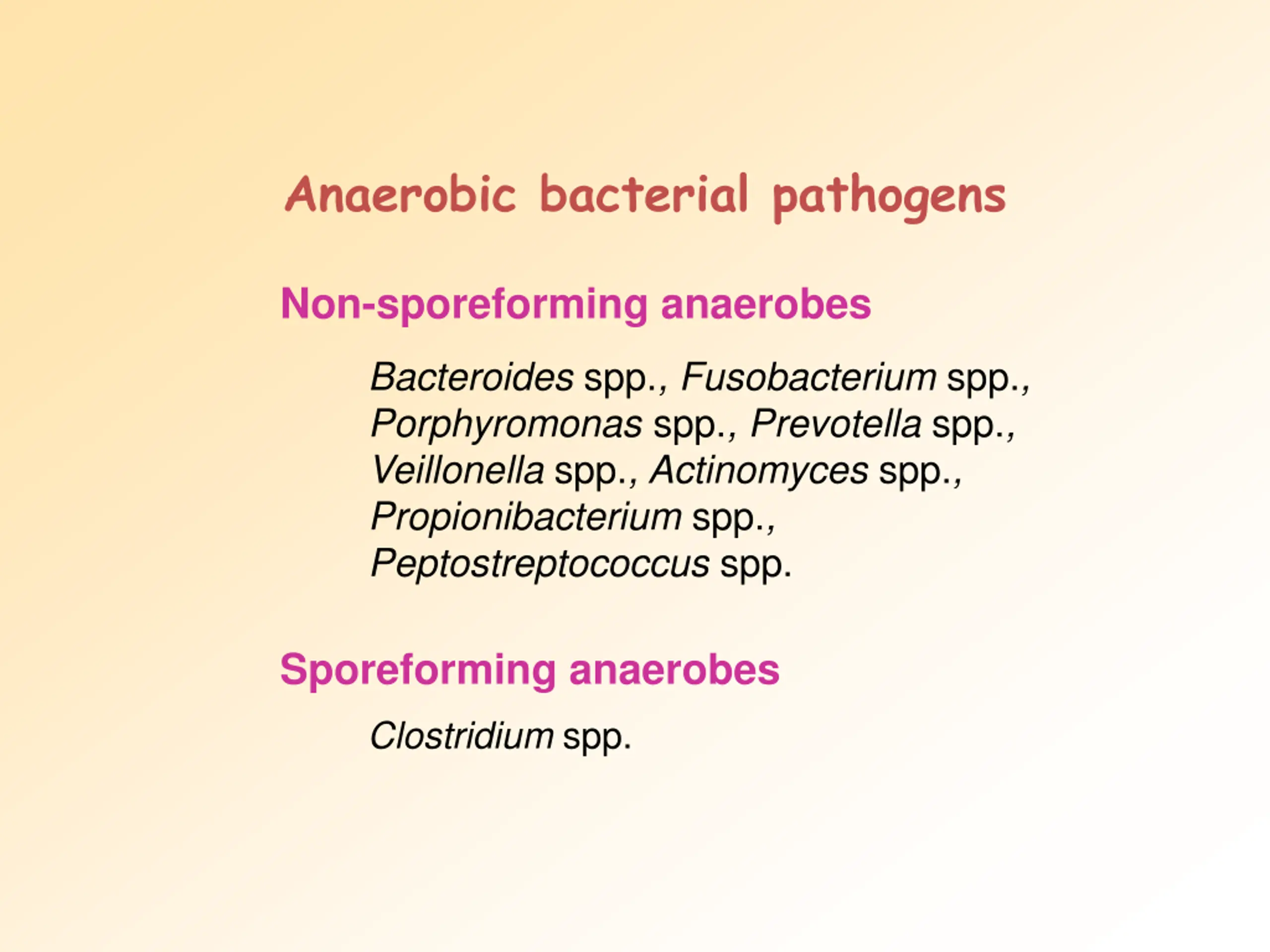Anaerobic bacterial pathogens Non-sporeforming anaerobes Bacteroides spp., Fusobacterium spp., Porphyromonas spp., Prevotella spp., Veillonella spp., Actinomyces spp., Propionibacterium spp., Peptostreptococcus spp. Sporeforming anaerobes Clostridium spp.