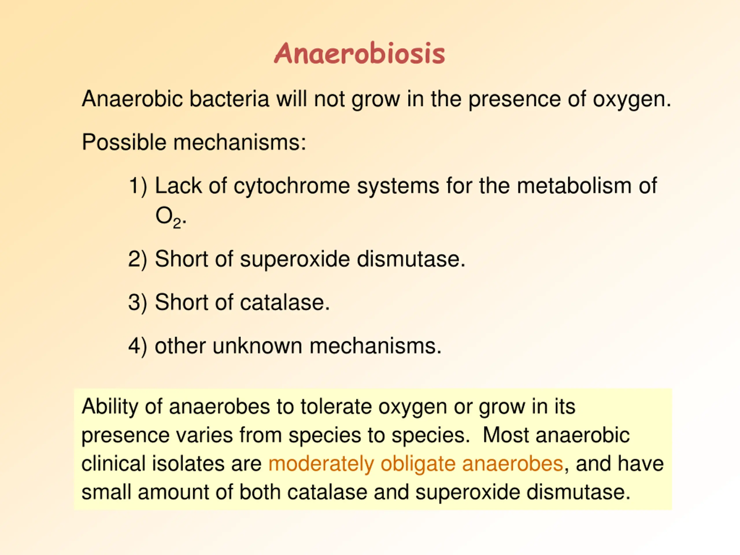 Anaerobiosis Anaerobic bacteria will not grow in the presence of oxygen. Possible mechanisms: 1) Lack of cytochrome systems for the metabolism of O2. 2) Short of superoxide dismutase. 3) Short of catalase. 4) other unknown mechanisms. Ability of anaerobes to tolerate oxygen or grow in its presence varies from species to species. Most anaerobic clinical isolates are moderately obligate anaerobes, and have small amount of both catalase and superoxide dismutase.