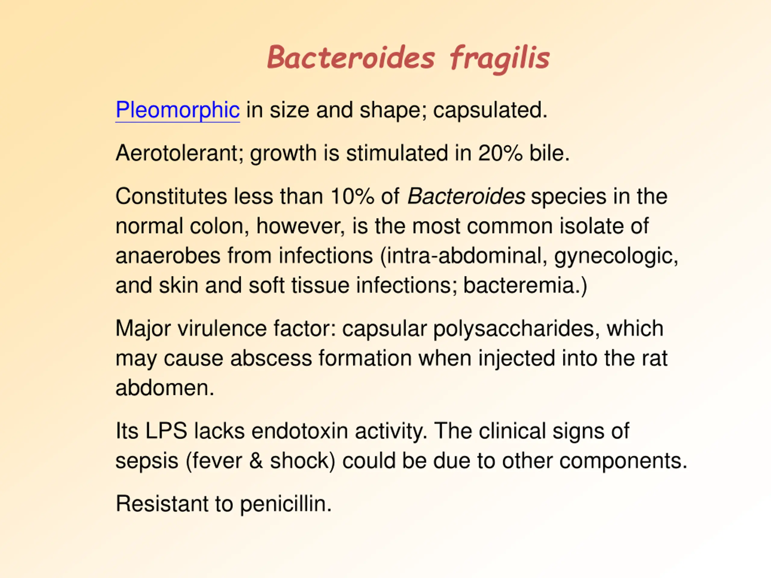 Bacteroides fragilis Pleomorphic in size and shape; capsulated. Aerotolerant; growth is stimulated in 20% bile. Constitutes less than 10% of Bacteroides species in the normal colon, however, is the most common isolate of anaerobes from infections (intra-abdominal, gynecologic, and skin and soft tissue infections; bacteremia.) Major virulence factor: capsular polysaccharides, which may cause abscess formation when injected into the rat abdomen. Its LPS lacks endotoxin activity. The clinical signs of sepsis (fever & shock) could be due to other components. Resistant to penicillin.