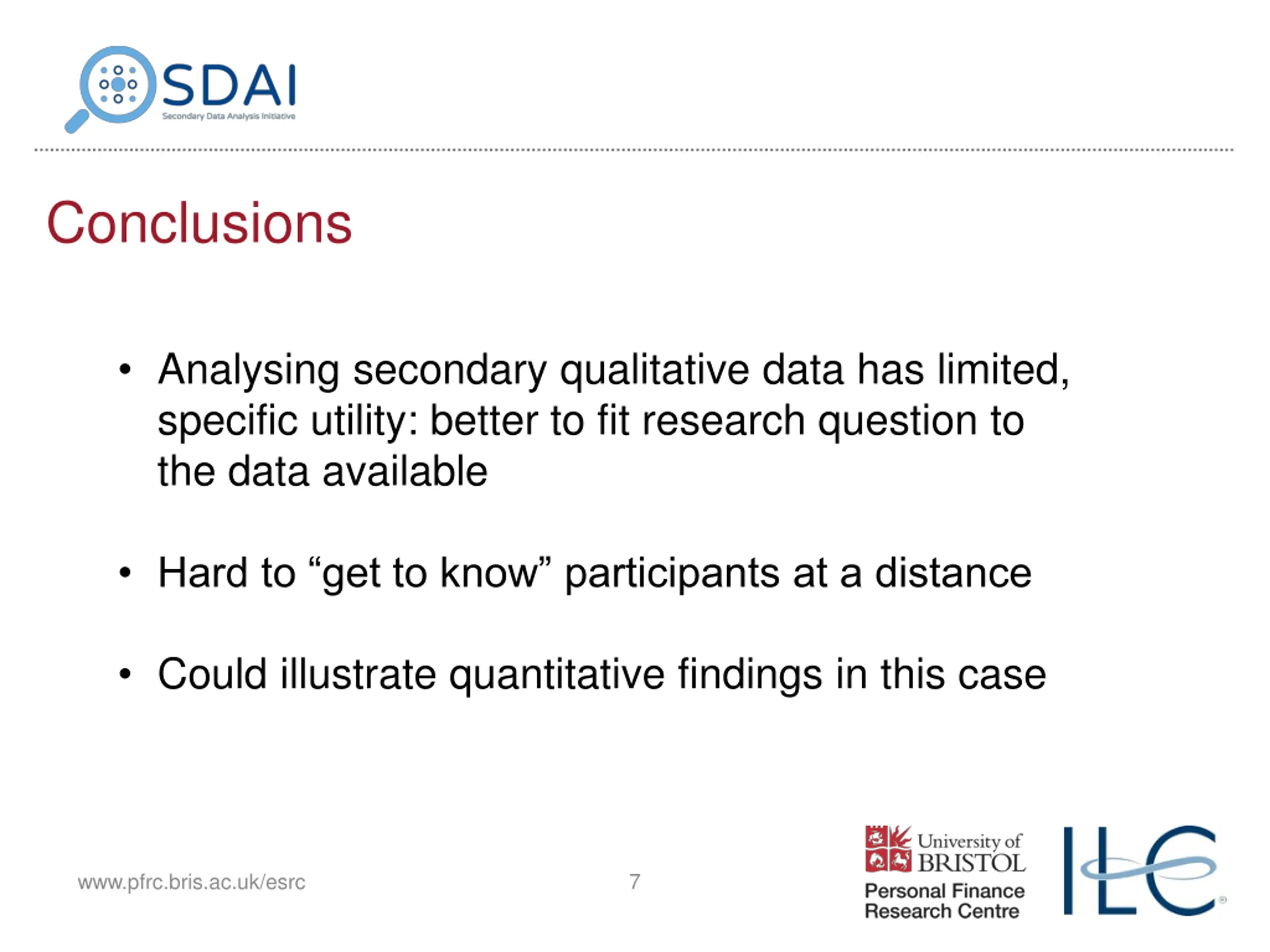 Conclusions Analysing secondary qualitative data has limited, specific utility: better to fit research question to the data available Hard to get to know participants at a distance Could illustrate quantitative findings in this case www.pfrc.bris.ac.uk/esrc 7