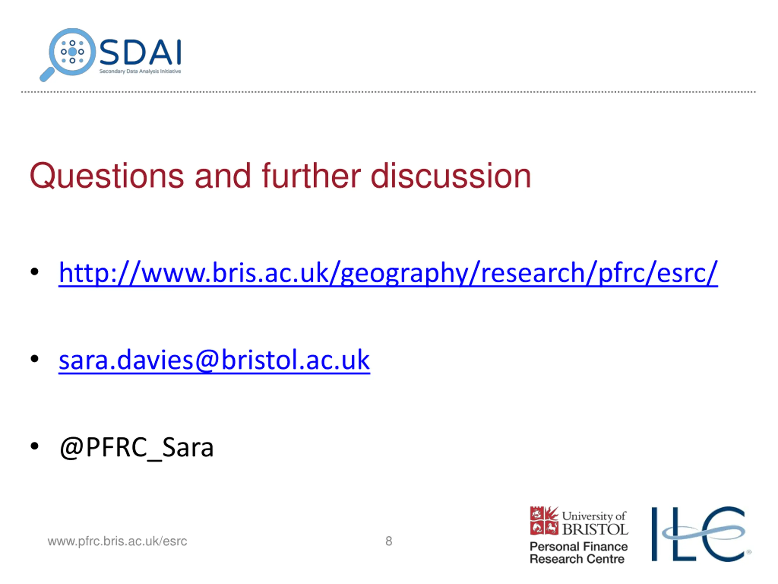 Questions and further discussion http://www.bris.ac.uk/geography/research/pfrc/esrc/ sara.davies@bristol.ac.uk @PFRC_Sara www.pfrc.bris.ac.uk/esrc 8