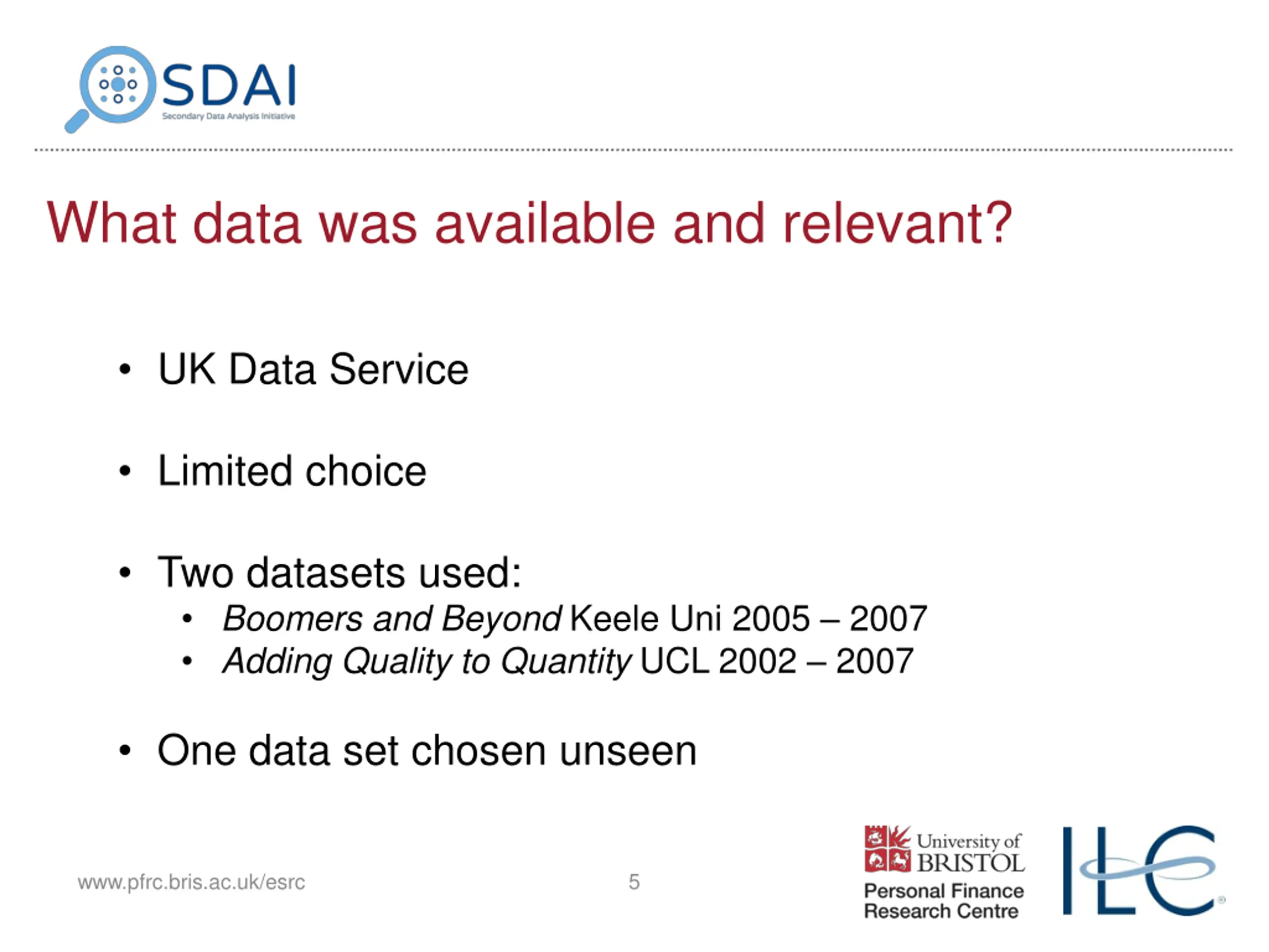 What data was available and relevant? UK Data Service Limited choice Two datasets used: Boomers and Beyond Keele Uni 2005 2007 Adding Quality to Quantity UCL 2002 2007 One data set chosen unseen www.pfrc.bris.ac.uk/esrc 5