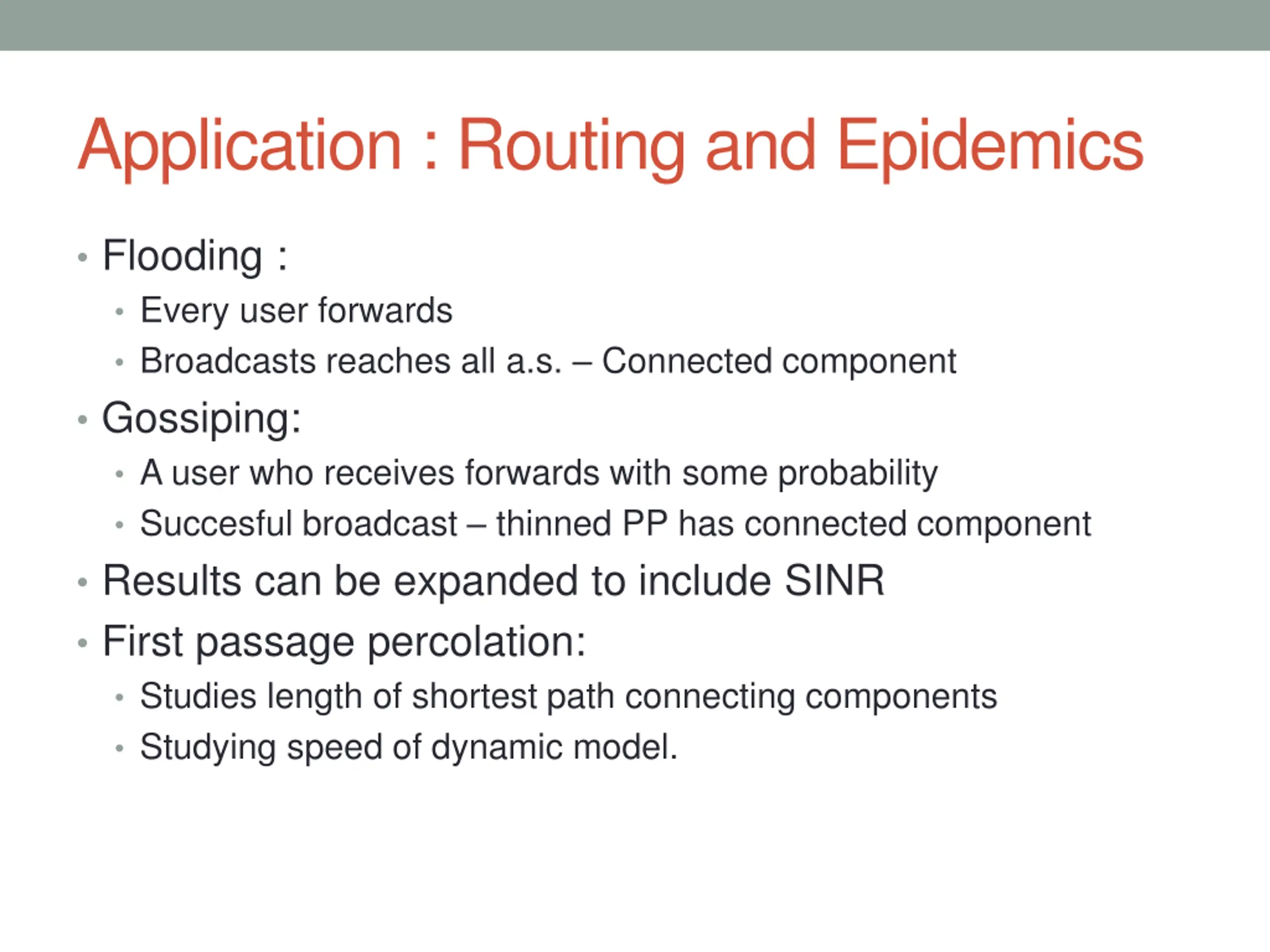 Application : Routing and Epidemics Flooding : Every user forwards Broadcasts reaches all a.s. Connected component Gossiping: A user who receives forwards with some probability Succesful broadcast thinned PP has connected component Results can be expanded to include SINR First passage percolation: Studies length of shortest path connecting components Studying speed of dynamic model.