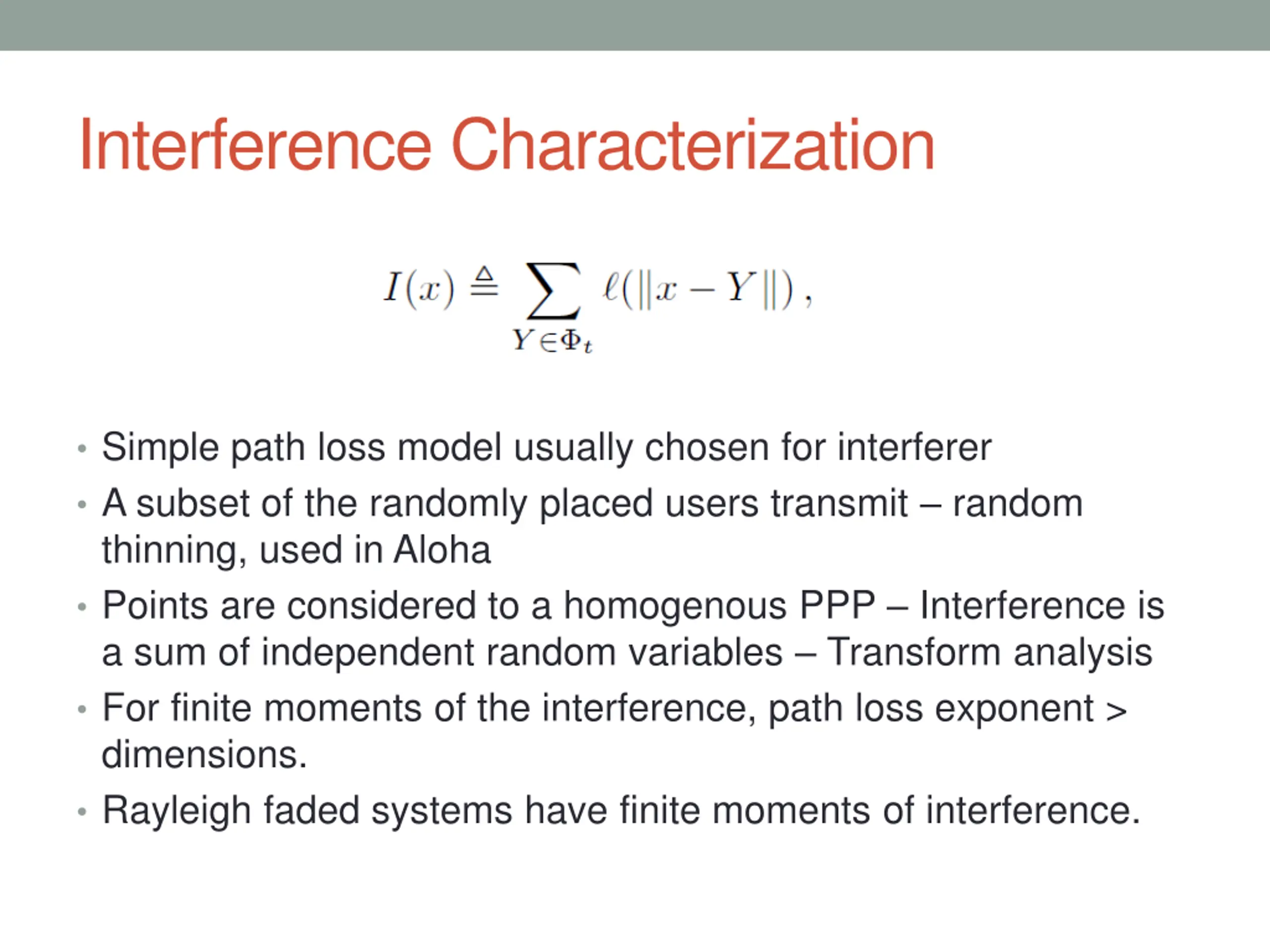 Interference Characterization Simple path loss model usually chosen for interferer A subset of the randomly placed users transmit random thinning, used in Aloha Points are considered to a homogenous PPP Interference is a sum of independent random variables Transform analysis For finite moments of the interference, path loss exponent > dimensions. Rayleigh faded systems have finite moments of interference.