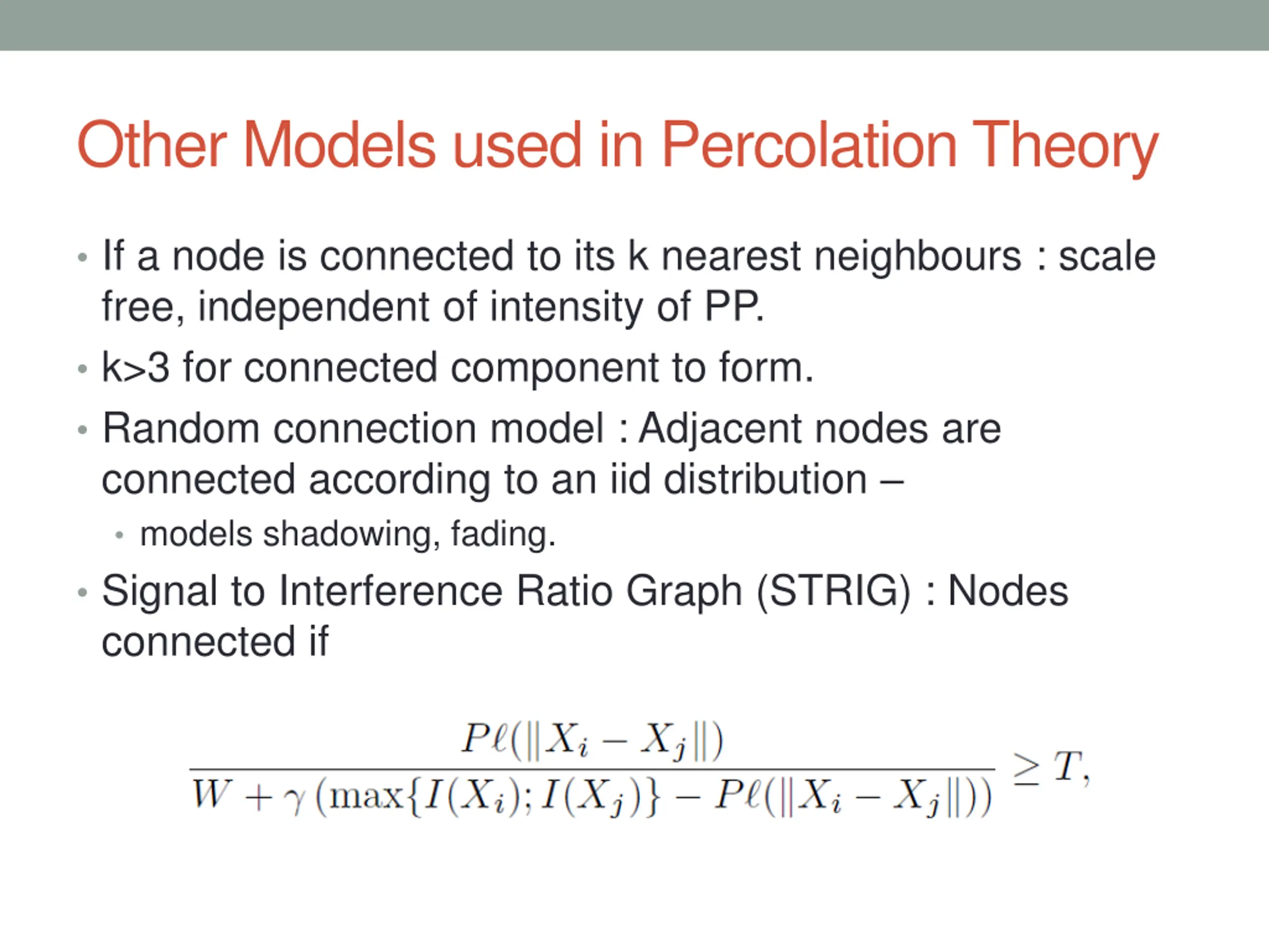 Other Models used in Percolation Theory If a node is connected to its k nearest neighbours : scale free, independent of intensity of PP. k>3 for connected component to form. Random connection model : Adjacent nodes are connected according to an iid distribution models shadowing, fading. Signal to Interference Ratio Graph (STRIG) : Nodes connected if