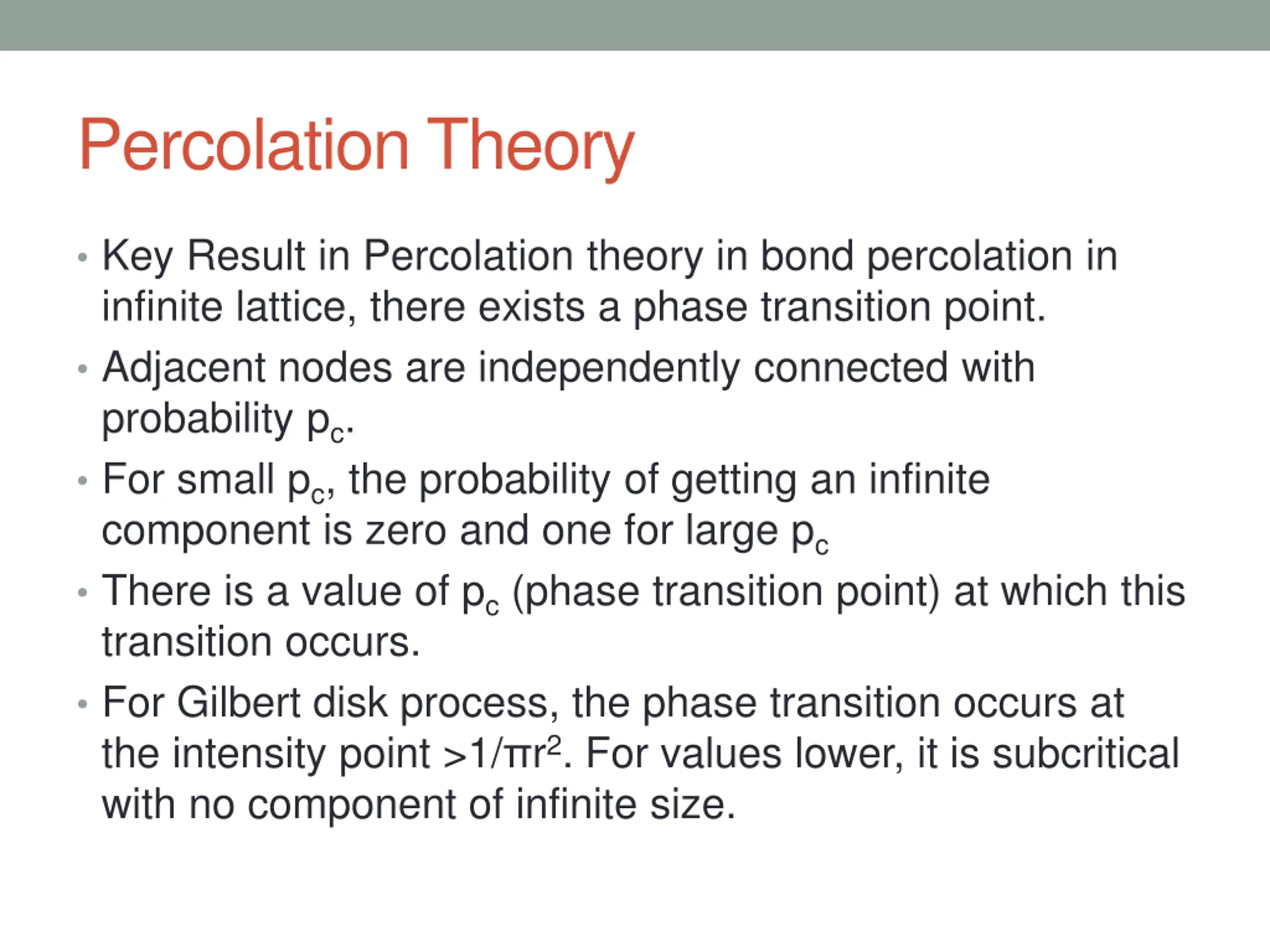 Percolation Theory Key Result in Percolation theory in bond percolation in infinite lattice, there exists a phase transition point. Adjacent nodes are independently connected with probability pc. For small pc, the probability of getting an infinite component is zero and one for large pc There is a value of pc (phase transition point) at which this transition occurs. For Gilbert disk process, the phase transition occurs at the intensity point >1/ r2. For values lower, it is subcritical with no component of infinite size.