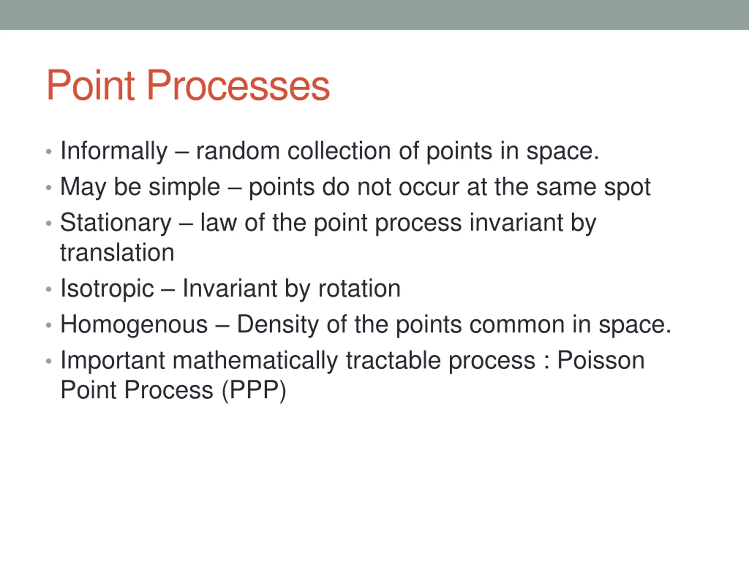 Point Processes Informally random collection of points in space. May be simple points do not occur at the same spot Stationary law of the point process invariant by translation Isotropic Invariant by rotation Homogenous Density of the points common in space. Important mathematically tractable process : Poisson Point Process (PPP)