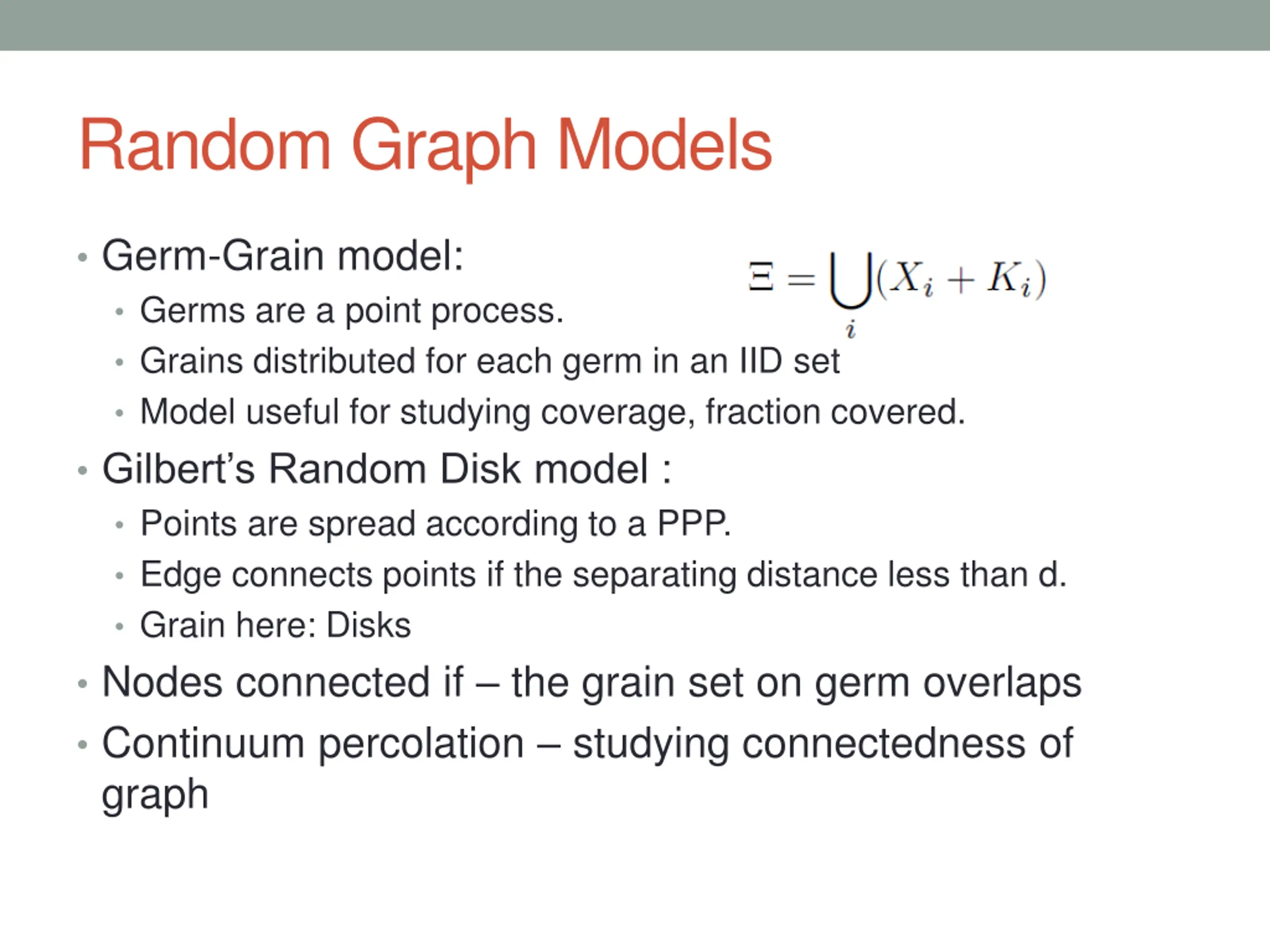Random Graph Models Germ-Grain model: Germs are a point process. Grains distributed for each germ in an IID set Model useful for studying coverage, fraction covered. Gilbert s Random Disk model : Points are spread according to a PPP. Edge connects points if the separating distance less than d. Grain here: Disks Nodes connected if the grain set on germ overlaps Continuum percolation studying connectedness of graph