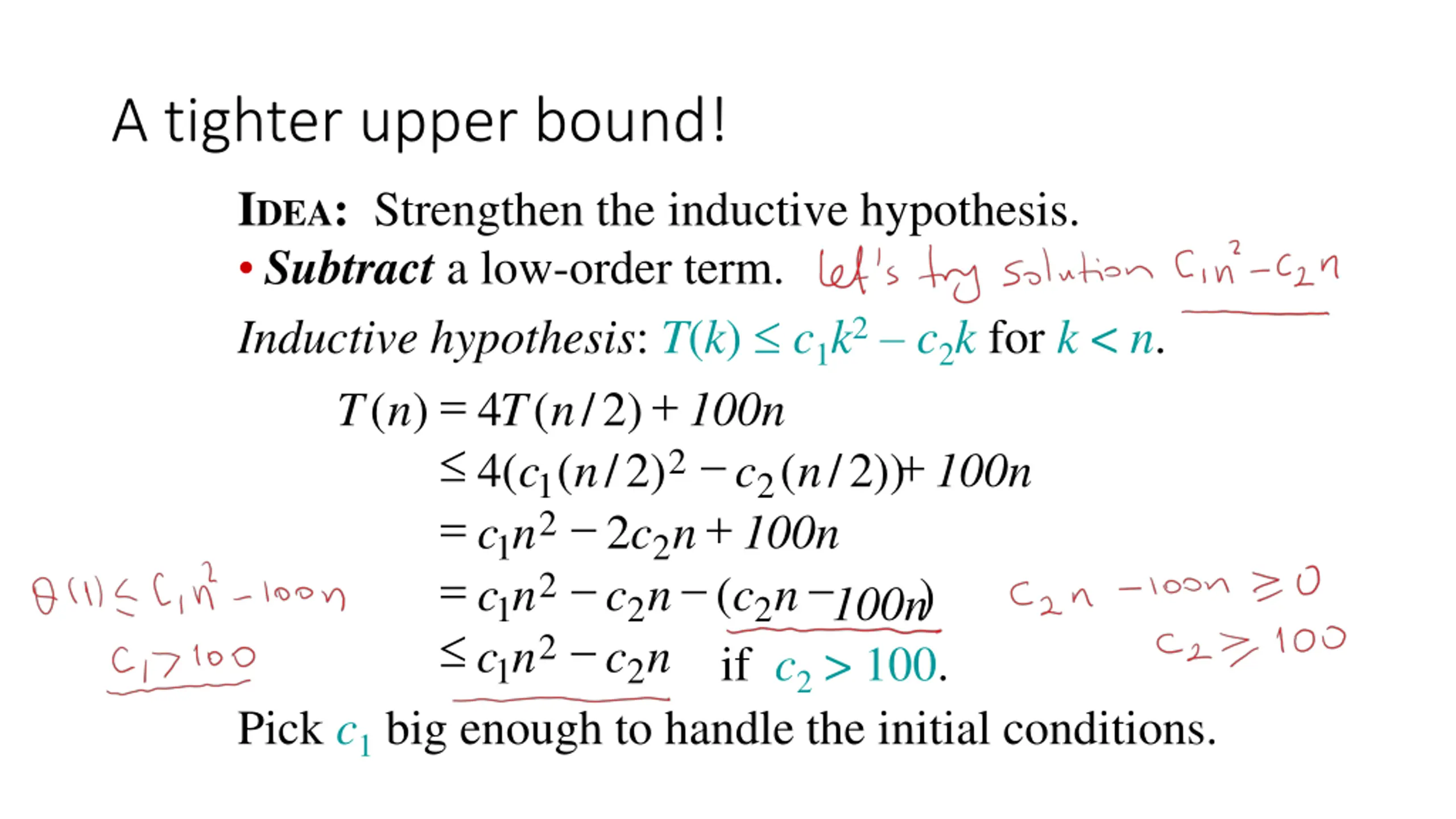 A tighter upper bound! IDEA: Strengthen the inductive hypothesis. Subtract a low-order term. Inductive hypothesis: T(k) c1k2 c2k for k < n. ) 2 / ( 4 ) ( n c = = + T n T n 100n + 2 n ( 4 c ( ) 2 / c ( / 2 )) c n 100n 1 2 + 2 2 c n 100n 1 2 n = 2 ( c n c n ) 100n 1 2 2 2 c n c n if c2> 100. 1 2 Pick c1big enough to handle the initial conditions.