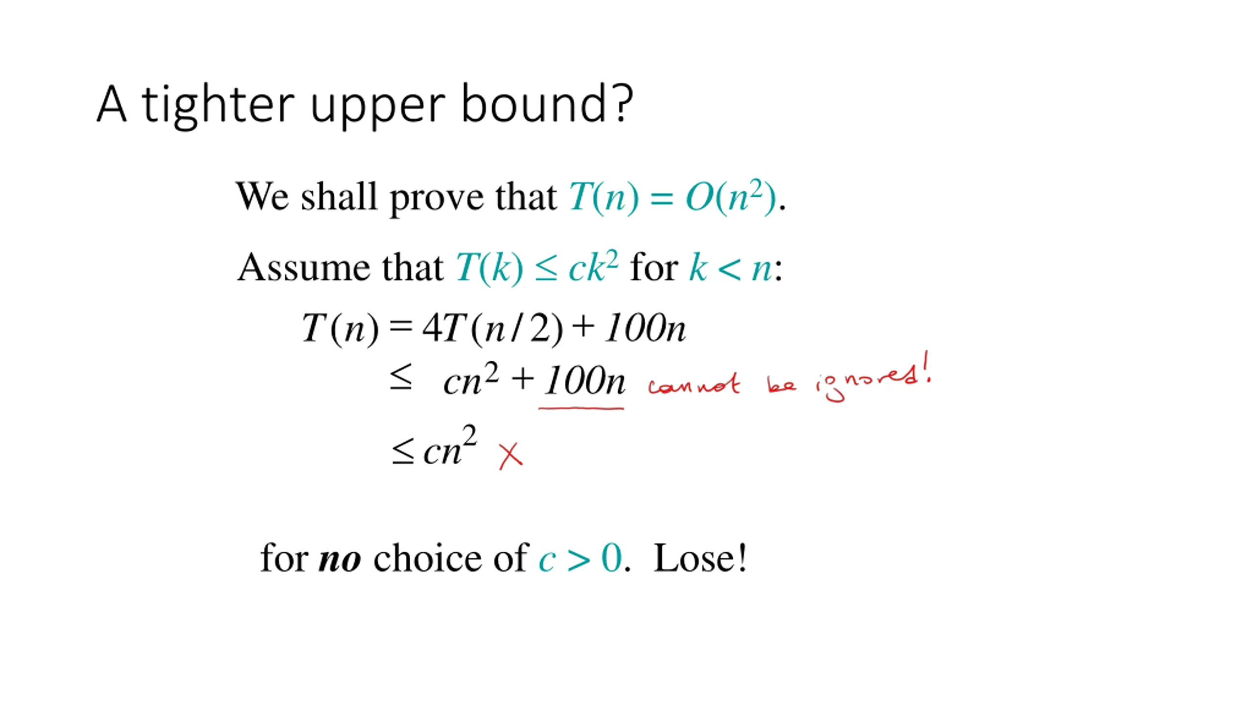 A tighter upper bound? We shall prove that T(n) = O(n2). Assume that T(k) ck2for k < n: ( 4 ) ( 2 cn 2 cn = + ) 2 / + T n T n 100n 100n for no choice of c > 0. Lose!
