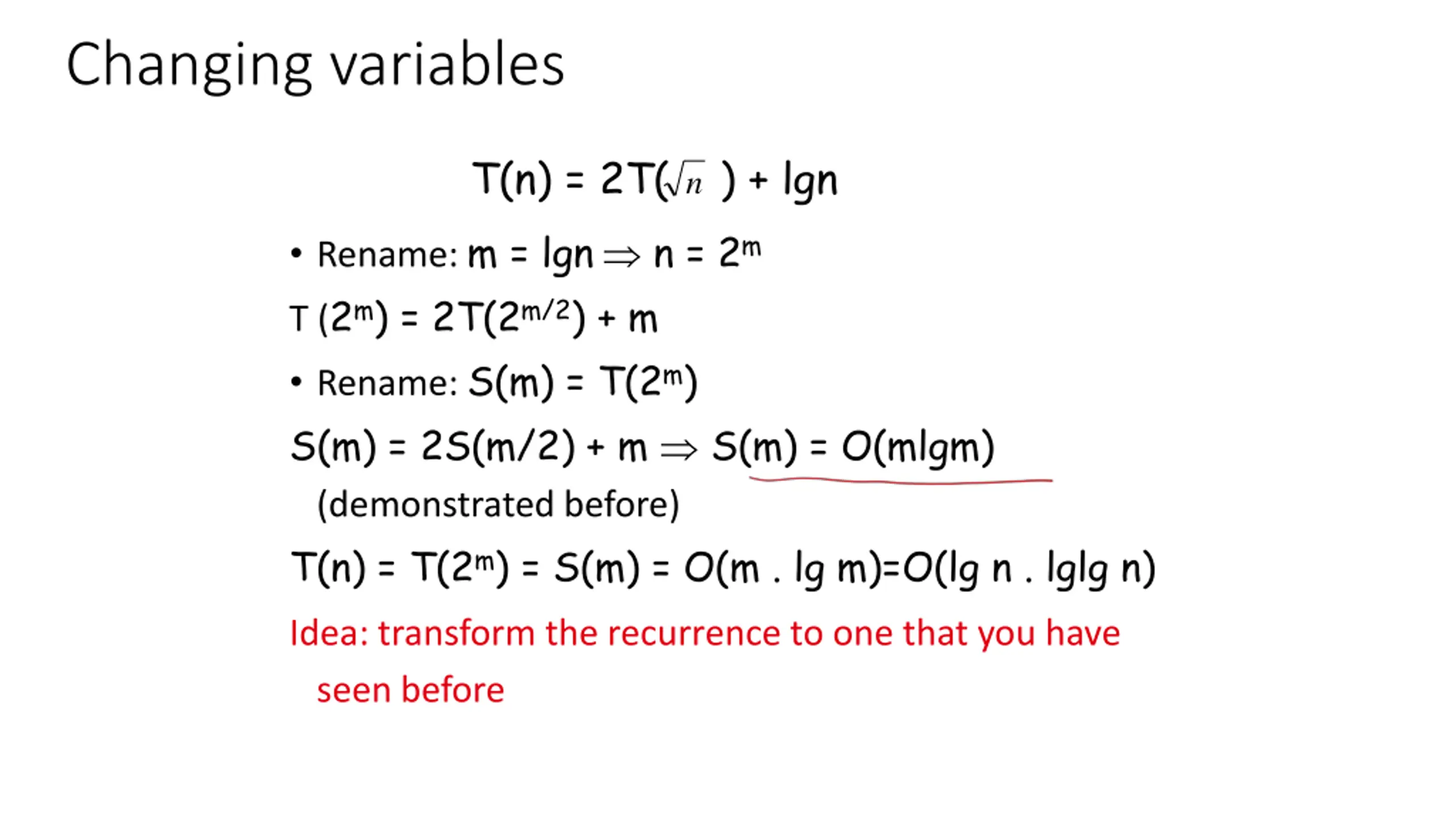 Changing variables T(n) = 2T( ) + lgn n Rename: m = lgn n = 2m T (2m) = 2T(2m/2) + m Rename: S(m) = T(2m) S(m) = 2S(m/2) + m S(m) = O(mlgm) (demonstrated before) T(n) = T(2m) = S(m) = O(m . lg m)=O(lg n . lglg n) Idea: transform the recurrence to one that you have seen before