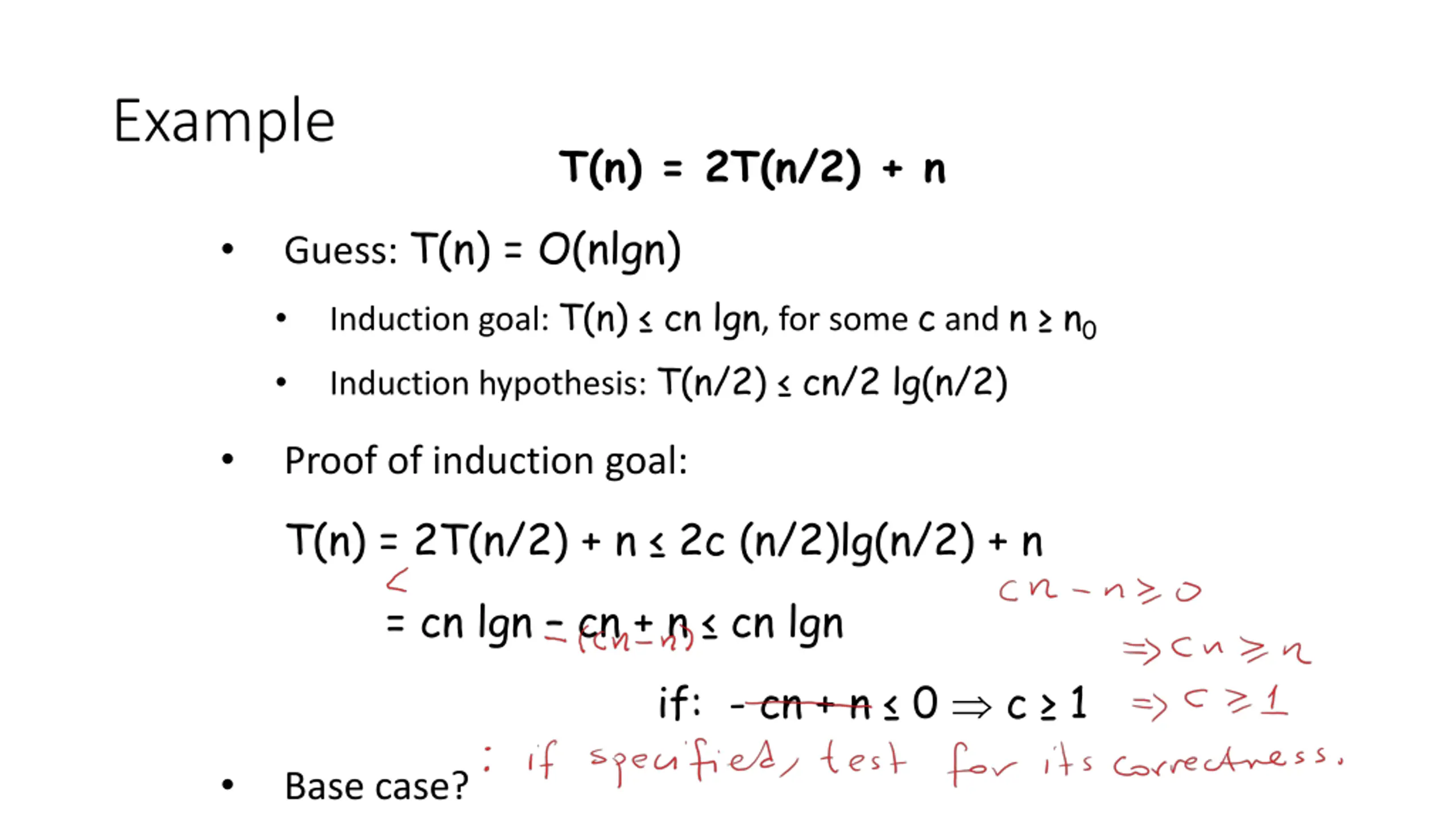 Example T(n) = 2T(n/2) + n Guess: T(n) = O(nlgn) Induction goal: T(n) cn lgn, for some c and n n0 Induction hypothesis: T(n/2) cn/2 lg(n/2) Proof of induction goal: T(n) = 2T(n/2) + n 2c (n/2)lg(n/2) + n = cn lgn cn + n cn lgn if: - cn + n 0 c 1 Base case?