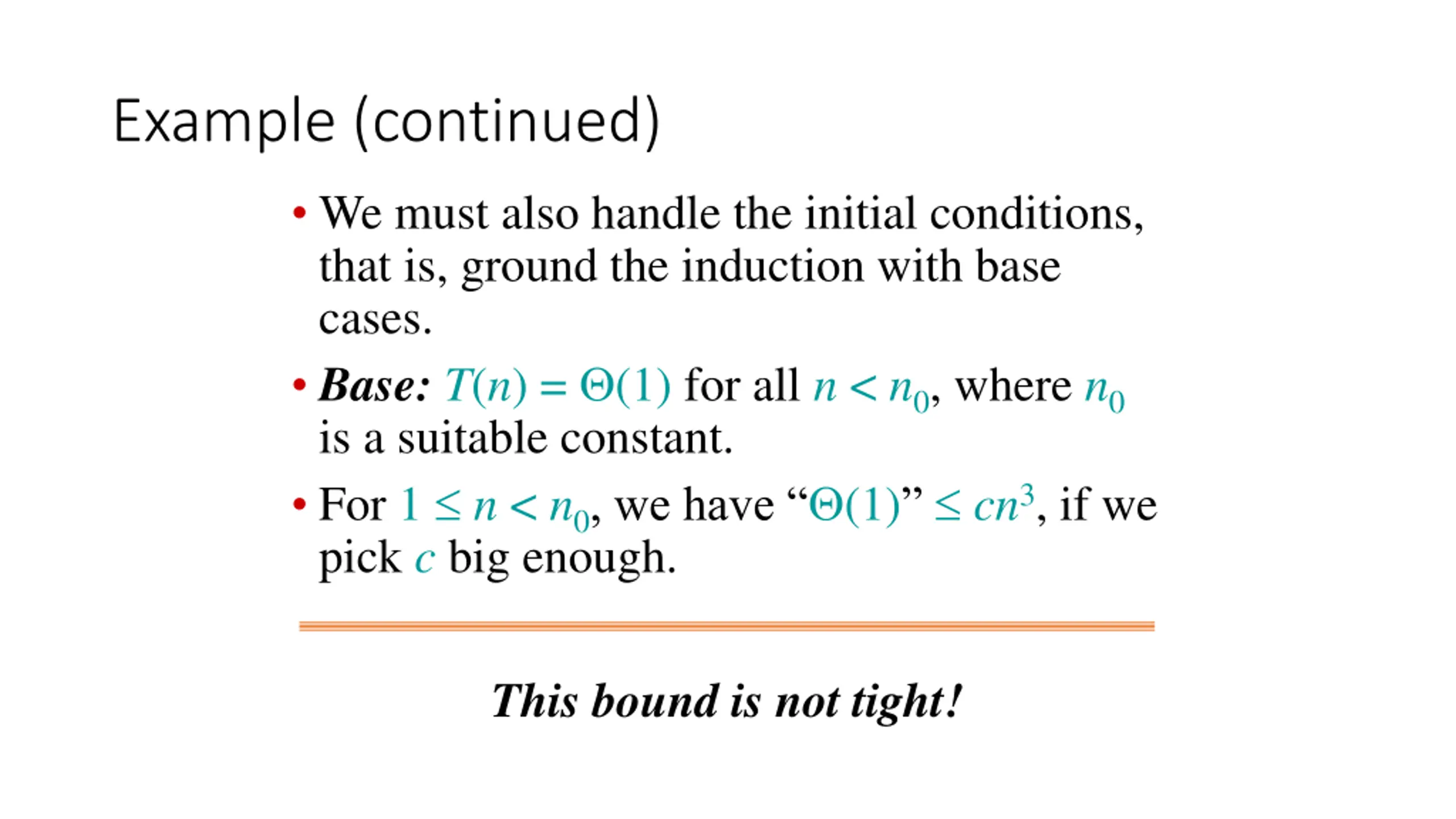 Example (continued) We must also handle the initial conditions, that is, ground the induction with base cases. Base: T(n) = (1) for all n < n0, where n0 is a suitable constant. For 1 n < n0, we have (1) cn3, if we pick c big enough. This bound is not tight!