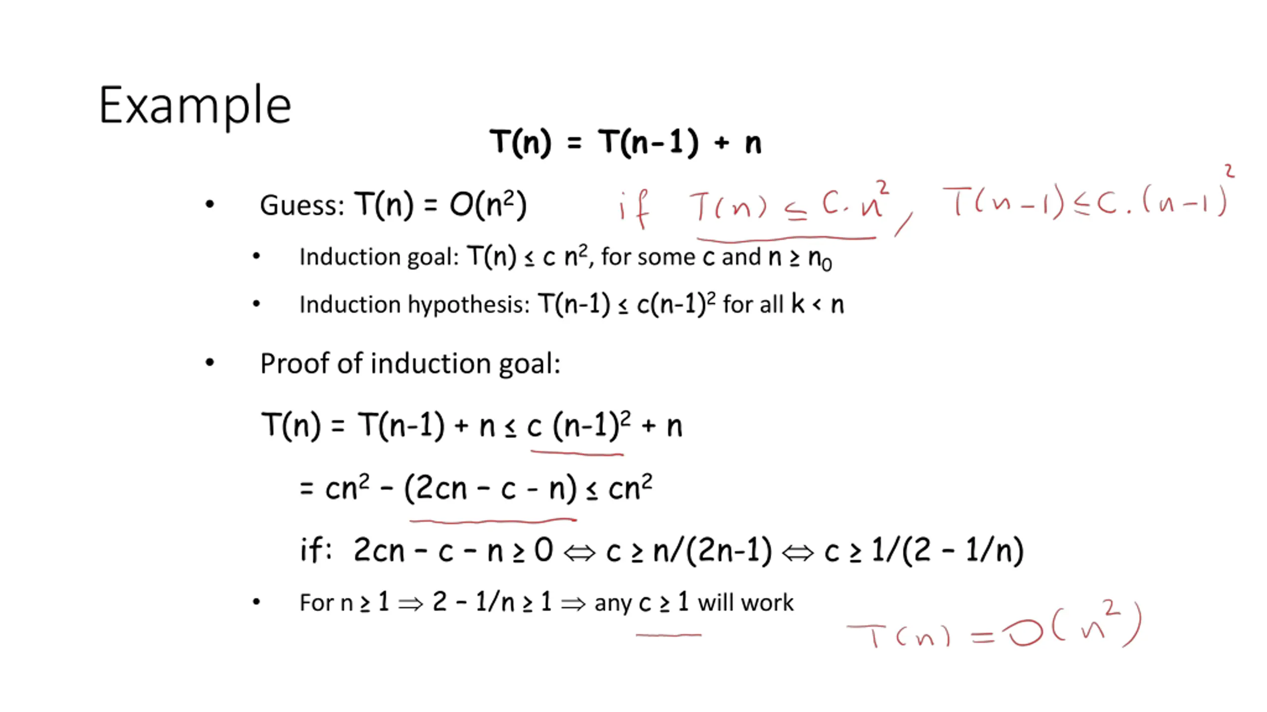 Example T(n) = T(n-1) + n Guess: T(n) = O(n2) Induction goal: T(n) c n2, for some c and n n0 Induction hypothesis: T(n-1) c(n-1)2for all k < n Proof of induction goal: T(n) = T(n-1) + n c (n-1)2+ n = cn2 (2cn c - n) cn2 if: 2cn c n 0 c n/(2n-1) c 1/(2 1/n) For n 1 2 1/n 1 any c 1 will work