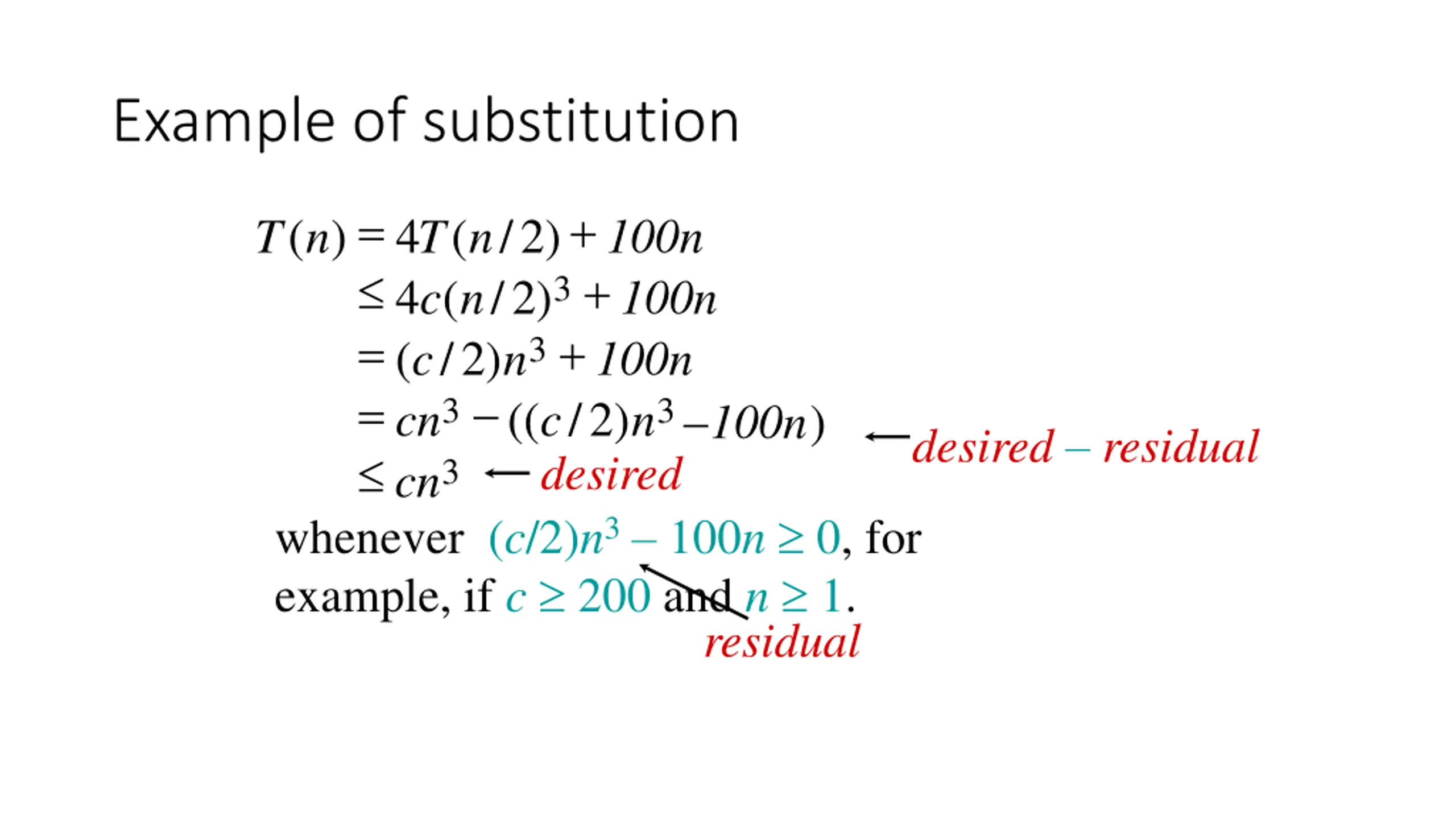 Example of substitution = + ( ) 4 ( ) 2 / T n T n 100n + 3 + 4 ( ) 2 / n c n 100n = 3 ( cn ) 2 / c 100n = 3 3 (( ) 2 / c n ) 100n desired residual desired 3 cn whenever (c/2)n3 100n 0, for example, if c 200 and n 1. residual