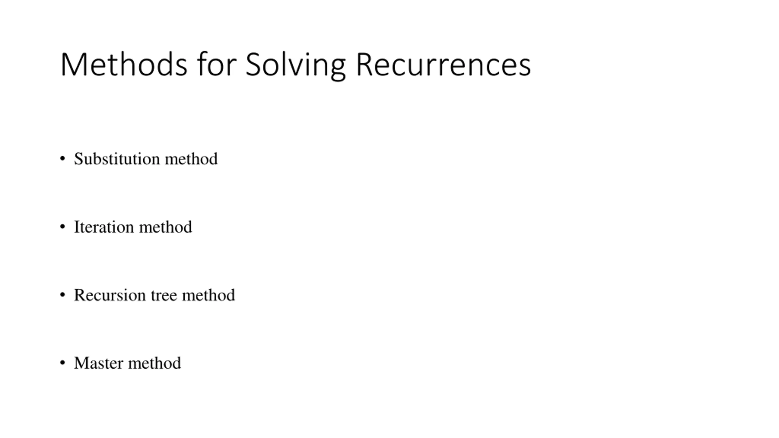 Methods for Solving Recurrences Substitution method Iteration method Recursion tree method Master method