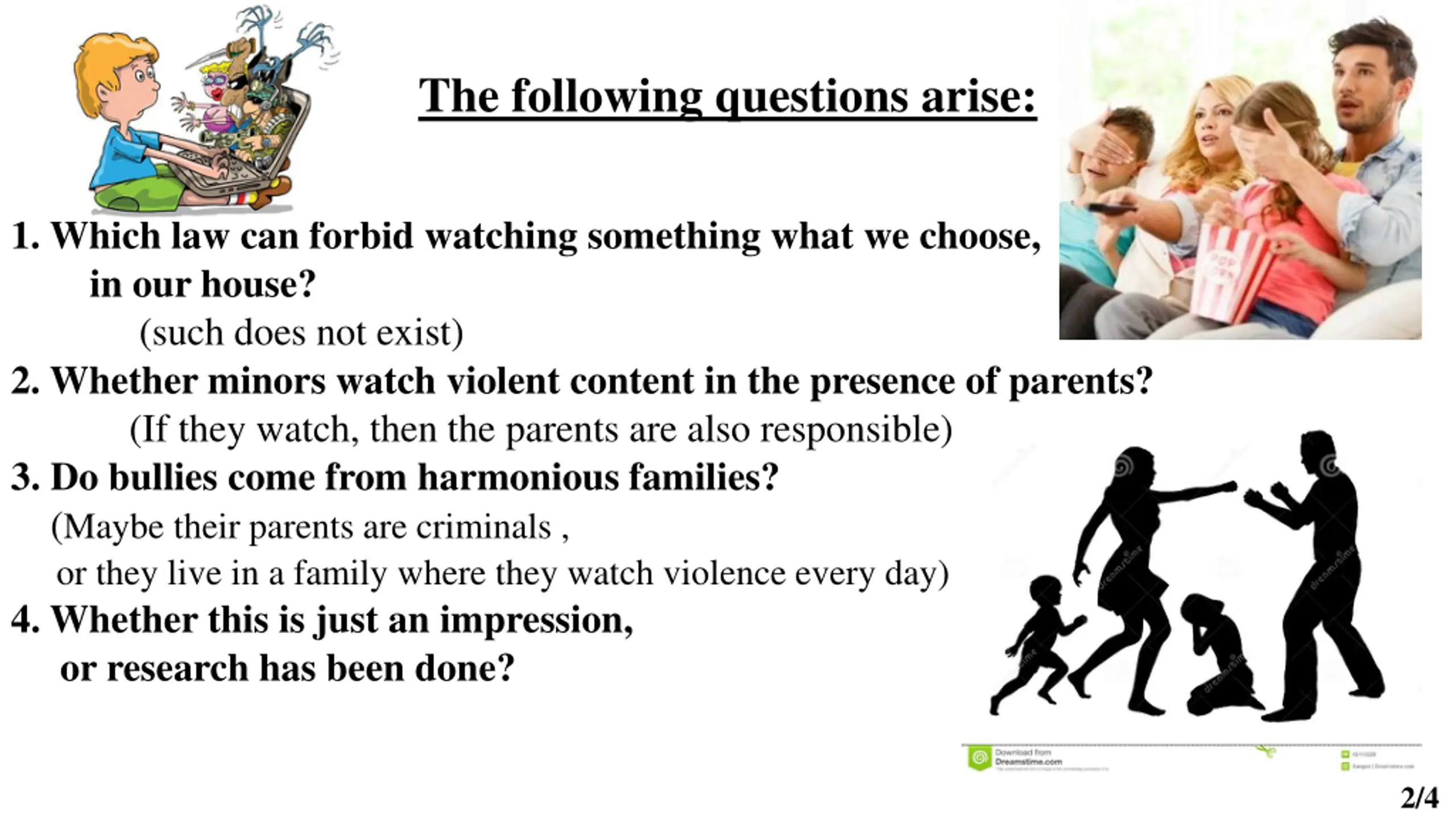 The following questions arise: 1. Which law can forbid watching something what we choose, in our house? (such does not exist) 2. Whether minors watch violent content in the presence of parents? (If they watch, then the parents are also responsible) 3. Do bullies come from harmonious families? (Maybe their parents are criminals , or they live in a family where they watch violence every day) 4. Whether this is just an impression, or research has been done? 2/4