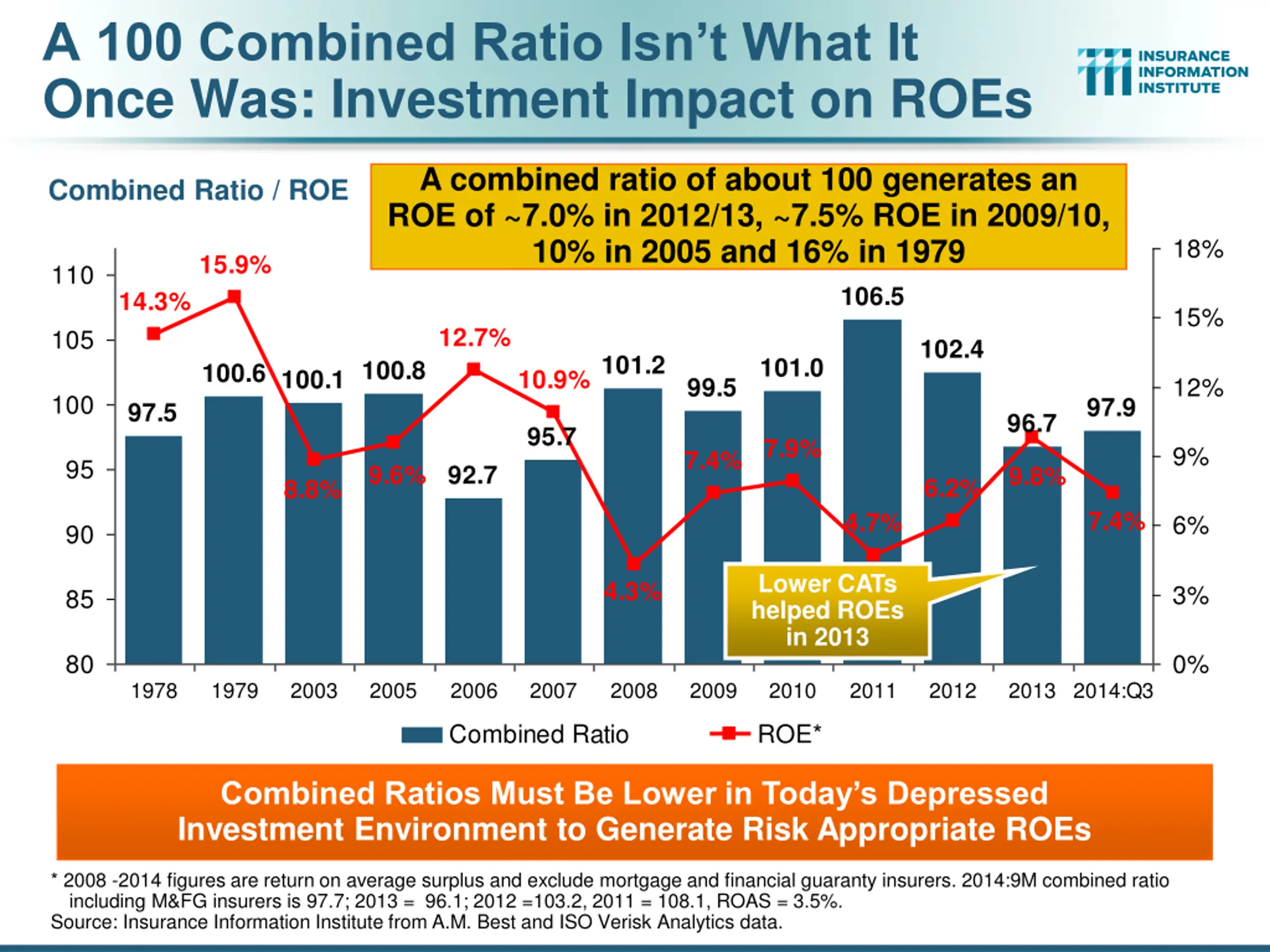 A 100 Combined Ratio Isnt What It Once Was: Investment Impact on ROEs A combined ratio of about 100 generates an ROE of ~7.0% in 2012/13, ~7.5% ROE in 2009/10, 10% in 2005 and 16% in 1979 Combined Ratio / ROE 18% 15.9% 110 106.5 14.3% 15% 12.7% 105 102.4 101.2 101.0 100.6100.1100.8 10.9% 12% 99.5 100 97.9 97.5 96.7 95.7 7.9% 9% 7.4% 95 9.6% 92.7 9.8% 6.2% 8.8% 7.4% 4.7% 6% 90 Lower CATs helped ROEs in 2013 4.3% 3% 85 80 0% 1978 1979 2003 2005 2006 2007 2008 2009 2010 2011 2012 2013 2014:Q3 Combined Ratio ROE* Combined Ratios Must Be Lower in Today s Depressed Investment Environment to Generate Risk Appropriate ROEs * 2008 -2014 figures are return on average surplus and exclude mortgage and financial guaranty insurers. 2014:9M combined ratio including M&FG insurers is 97.7; 2013 = 96.1; 2012 =103.2, 2011 = 108.1, ROAS = 3.5%. Source: Insurance Information Institute from A.M. Best and ISO Verisk Analytics data.
