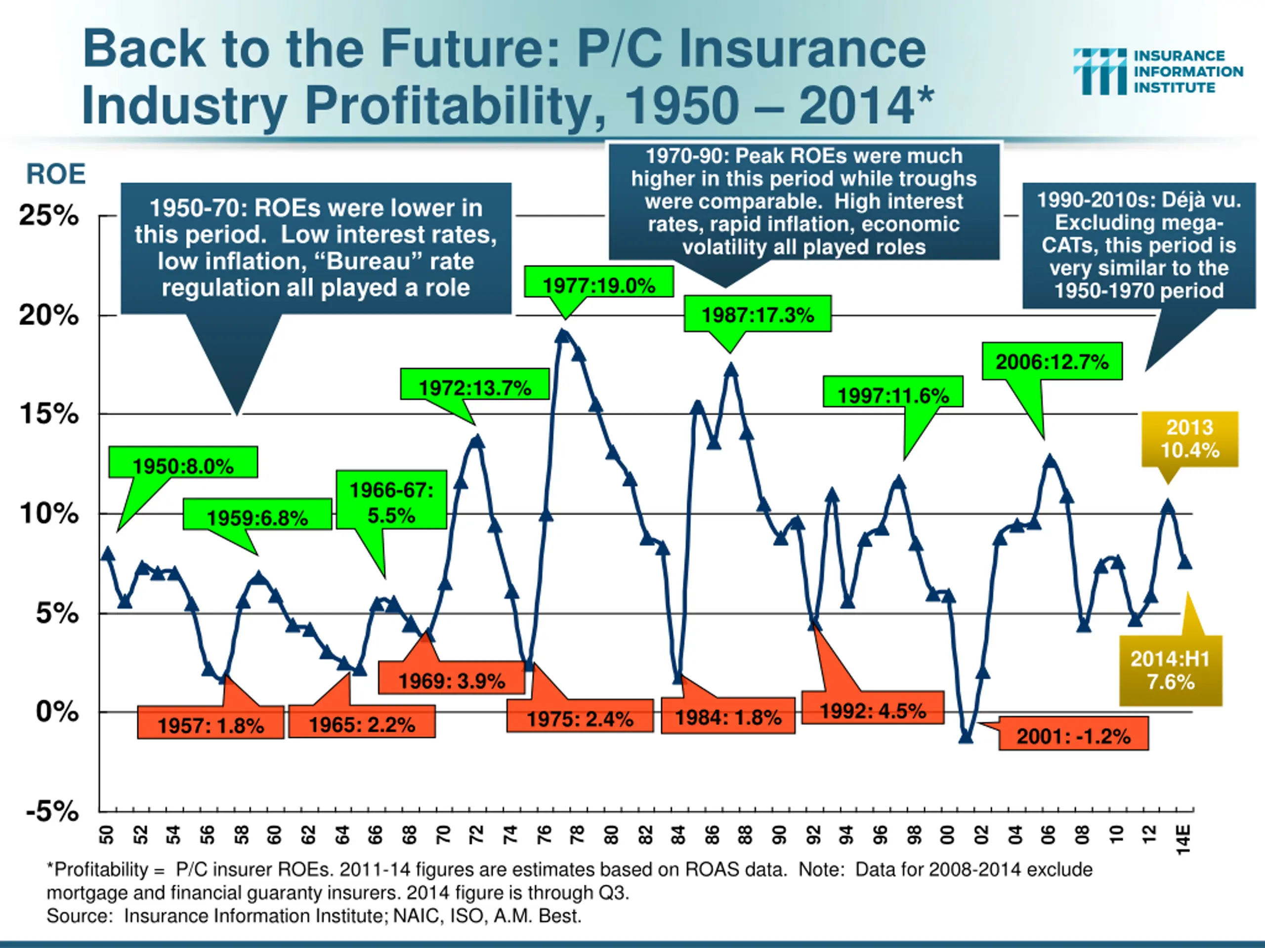 Back to the Future: P/C Insurance Industry Profitability, 1950 2014* 1970-90: Peak ROEs were much higher in this period while troughs were comparable. High interest rates, rapid inflation, economic volatility all played roles ROE 1990-2010s: D j vu. Excluding mega- CATs, this period is very similar to the 1950-1970 period 1950-70: ROEs were lower in this period. Low interest rates, low inflation, Bureau rate regulation all played a role 25% 1977:19.0% 20% 1987:17.3% 2006:12.7% 1972:13.7% 1997:11.6% 15% 2013 10.4% 1950:8.0% 1966-67: 5.5% 10% 1959:6.8% 5% 2014:H1 7.6% 1969: 3.9% 0% 1992: 4.5% 1984: 1.8% 1975: 2.4% 1965: 2.2% 1957: 1.8% 2001: -1.2% -5% 14E 50 52 54 56 58 60 62 64 66 68 70 72 74 76 78 80 82 84 86 88 90 92 94 96 98 00 02 04 06 08 10 12 *Profitability = P/C insurer ROEs. 2011-14 figures are estimates based on ROAS data. Note: Data for 2008-2014 exclude mortgage and financial guaranty insurers. 2014 figure is through Q3. Source: Insurance Information Institute; NAIC, ISO, A.M. Best.