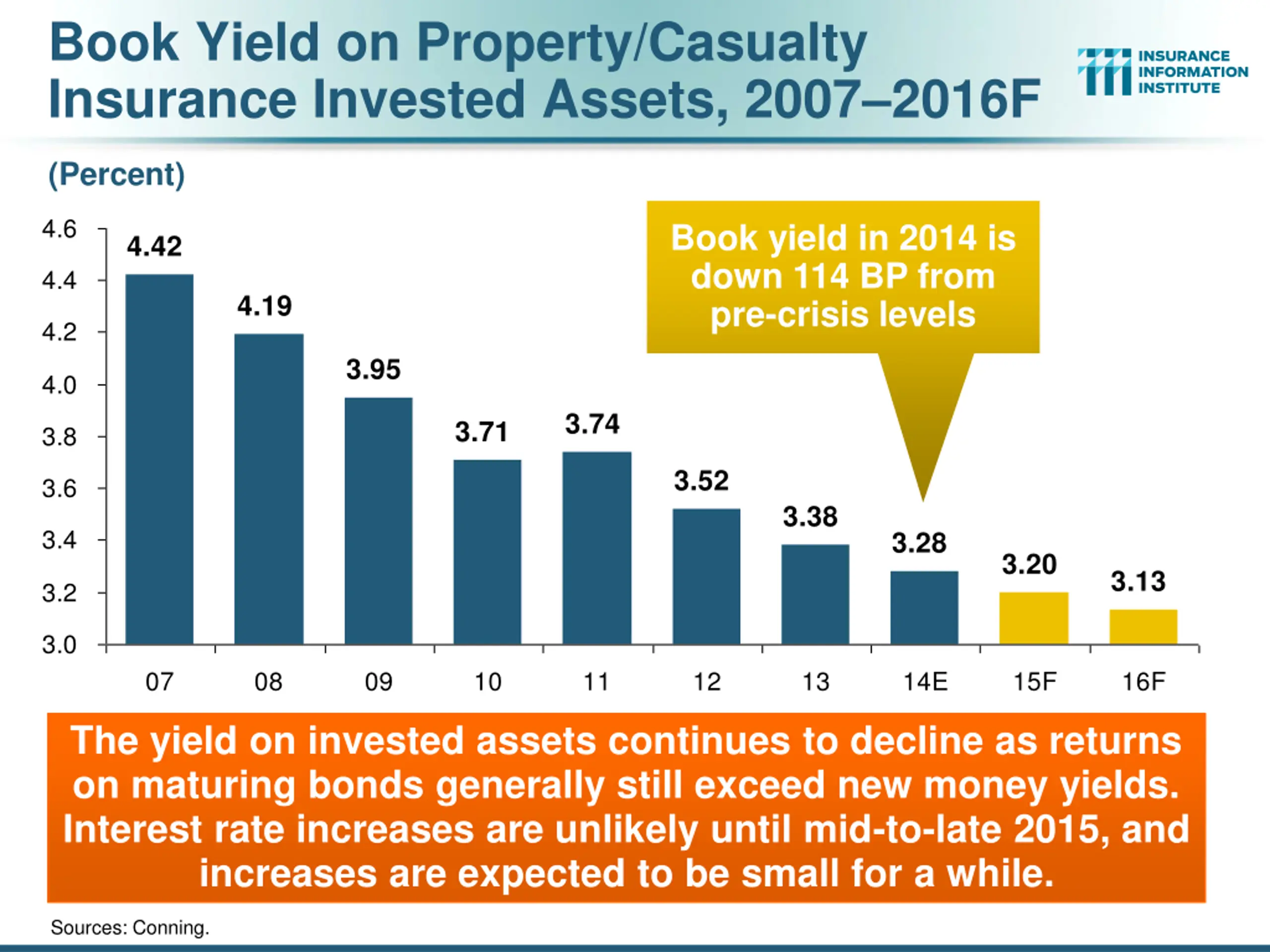 Book Yield on Property/Casualty Insurance Invested Assets, 2007 2016F (Percent) 4.6 Book yield in 2014 is down 114 BP from pre-crisis levels 4.42 4.4 4.19 4.2 3.95 4.0 3.74 3.71 3.8 3.52 3.6 3.38 3.4 3.28 3.20 3.13 3.2 3.0 07 08 09 10 11 12 13 14E 15F 16F The yield on invested assets continues to decline as returns on maturing bonds generally still exceed new money yields. Interest rate increases are unlikely until mid-to-late 2015, and increases are expected to be small for a while. Sources: Conning.