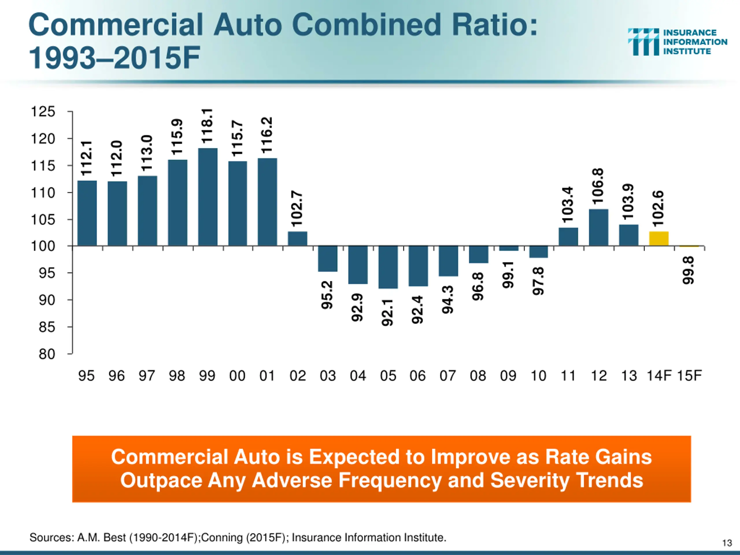 Commercial Auto Combined Ratio: 1993 2015F 125 118.1 116.2 115.9 115.7 120 113.0 112.1 112.0 115 106.8 103.9 110 103.4 102.7 102.6 105 100 99.8 99.1 95 97.8 96.8 95.2 94.3 90 92.9 92.4 92.1 85 80 95 96 97 98 99 00 01 02 03 04 05 06 07 08 09 10 11 12 13 14F 15F Commercial Auto is Expected to Improve as Rate Gains Outpace Any Adverse Frequency and Severity Trends Sources: A.M. Best (1990-2014F);Conning (2015F); Insurance Information Institute. 13