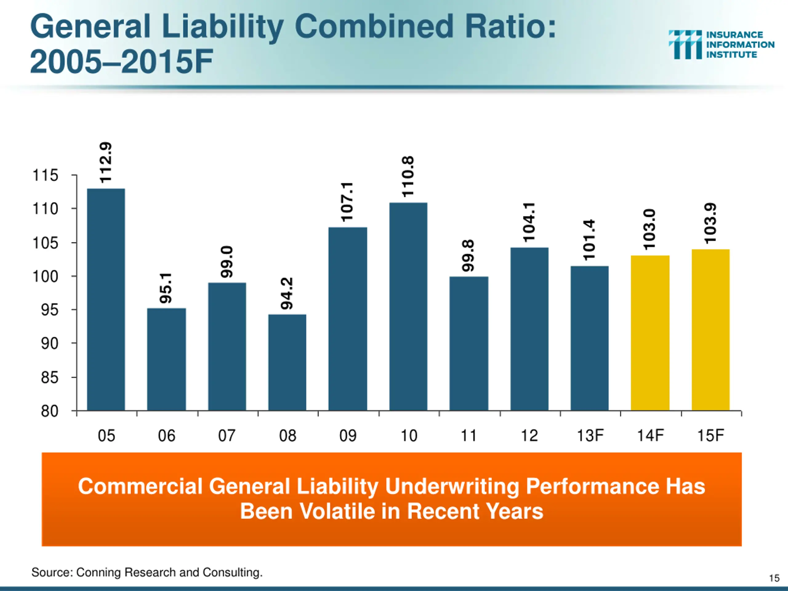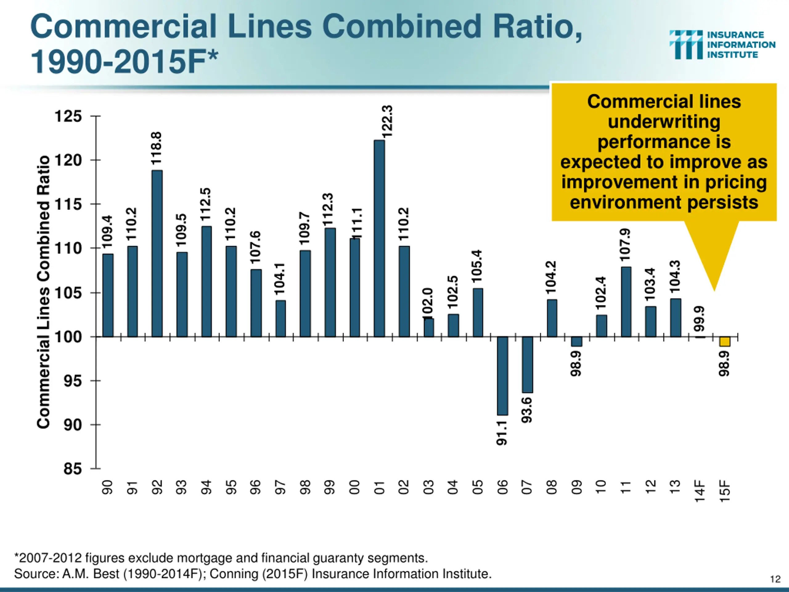 Commercial Multi-Peril Combined Ratio: 1995 2015F CMP-Liability CMP-Non-Liability 125.0 122.4 130 121.0 120.1 119.8 119.0 125 117.0 116.8 116.2 116.1 115.3 115.0 115.0 113.6 113.1 120 112.0 108.5 108.4 115 105.5 104.9 103.1 102.5 102.1 110 101.9 100.7 105 100 99.4 99.0 98.7 95 97.7 97.3 97.6 96.1 95.4 93.8 90 94.2 94.0 89.8 89.0 85 84.1 83.8 80 95 96 97 98 99 00 01 02 03 04 05 06 07 08 09 10 11 12 13 14F 15F Commercial Multi-Peril Underwriting Performance is Expected to Improve in 2013 Assuming Normal Catastrophe Loss Activity *2013F-2012F figures are Conning figures for the combined liability and non-liability components.. Sources: A.M. Best; Conning; Insurance Information Institute. 14