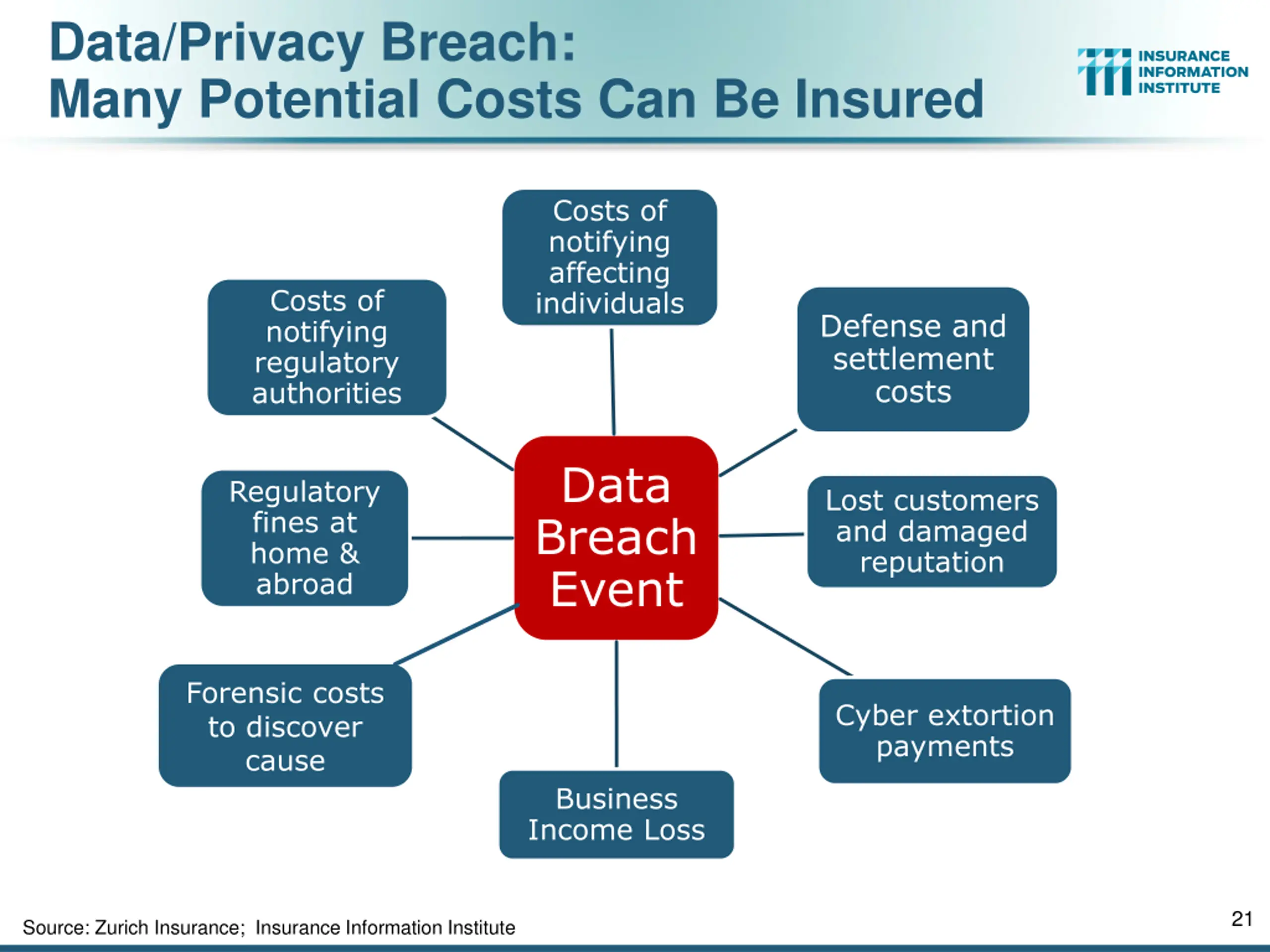 Data/Privacy Breach: Many Potential Costs Can Be Insured Costs of notifying affecting individuals Costs of notifying regulatory authorities Defense and settlement costs Data Breach Event Regulatory fines at home & abroad Lost customers and damaged reputation Forensic costs to discover cause Cyber extortion payments Business Income Loss 21 Source: Zurich Insurance; Insurance Information Institute