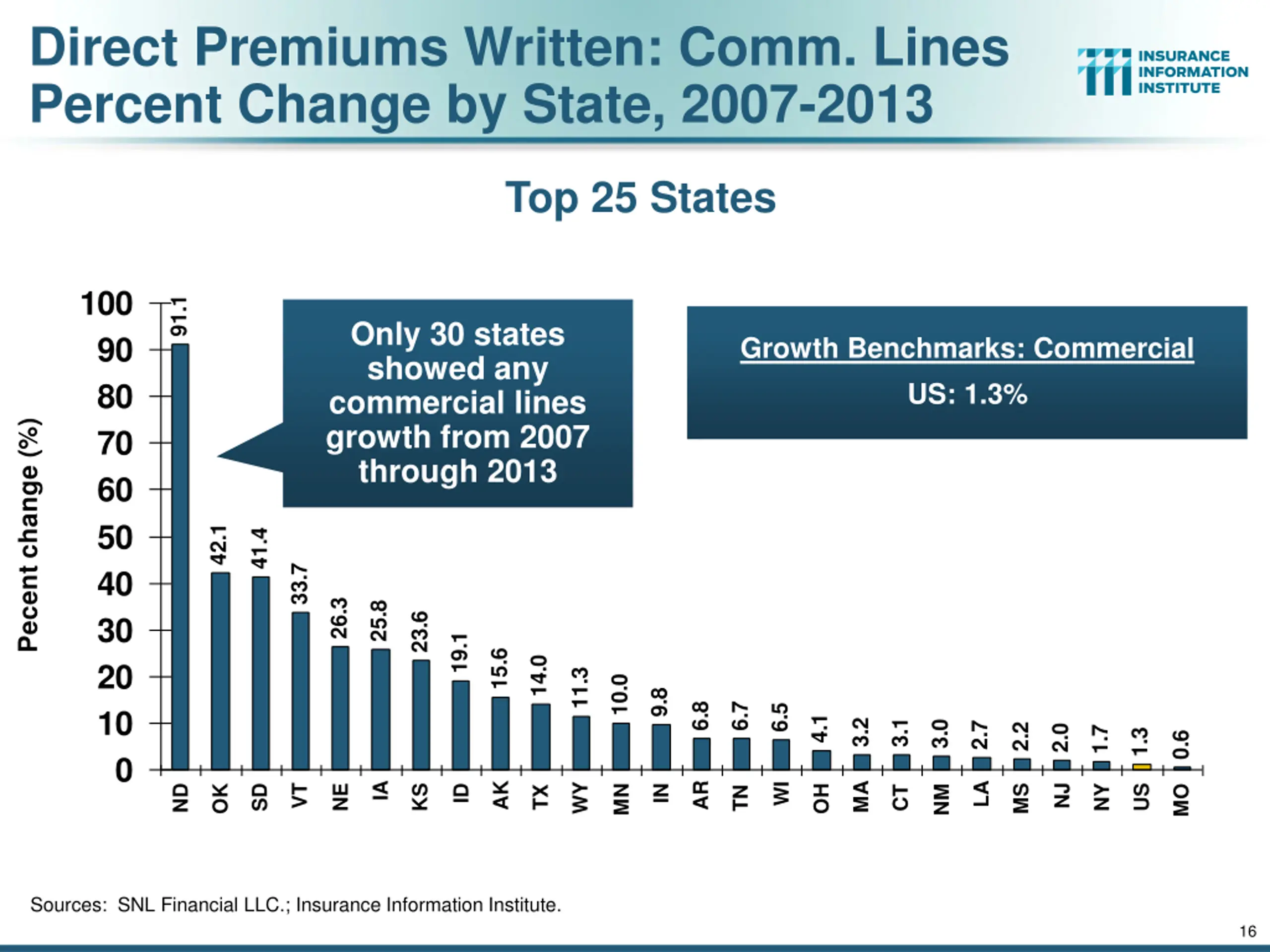 Direct Premiums Written: Comm. Lines Percent Change by State, 2007-2013 Top 25 States 100 91.1 Only 30 states showed any commercial lines growth from 2007 through 2013 90 Growth Benchmarks: Commercial US: 1.3% 80 Pecent change (%) 70 60 50 42.1 41.4 33.7 40 26.3 25.8 23.6 30 19.1 15.6 14.0 20 11.3 10.0 9.8 6.8 6.7 6.5 10 4.1 3.2 3.1 3.0 2.7 2.2 2.0 1.7 1.3 0.6 0 IA AK AR MA LA WI WY NJ VT NE KS MS NY US ND OK SD ID MN IN OH MO NM CT TX TN Sources: SNL Financial LLC.; Insurance Information Institute. 16
