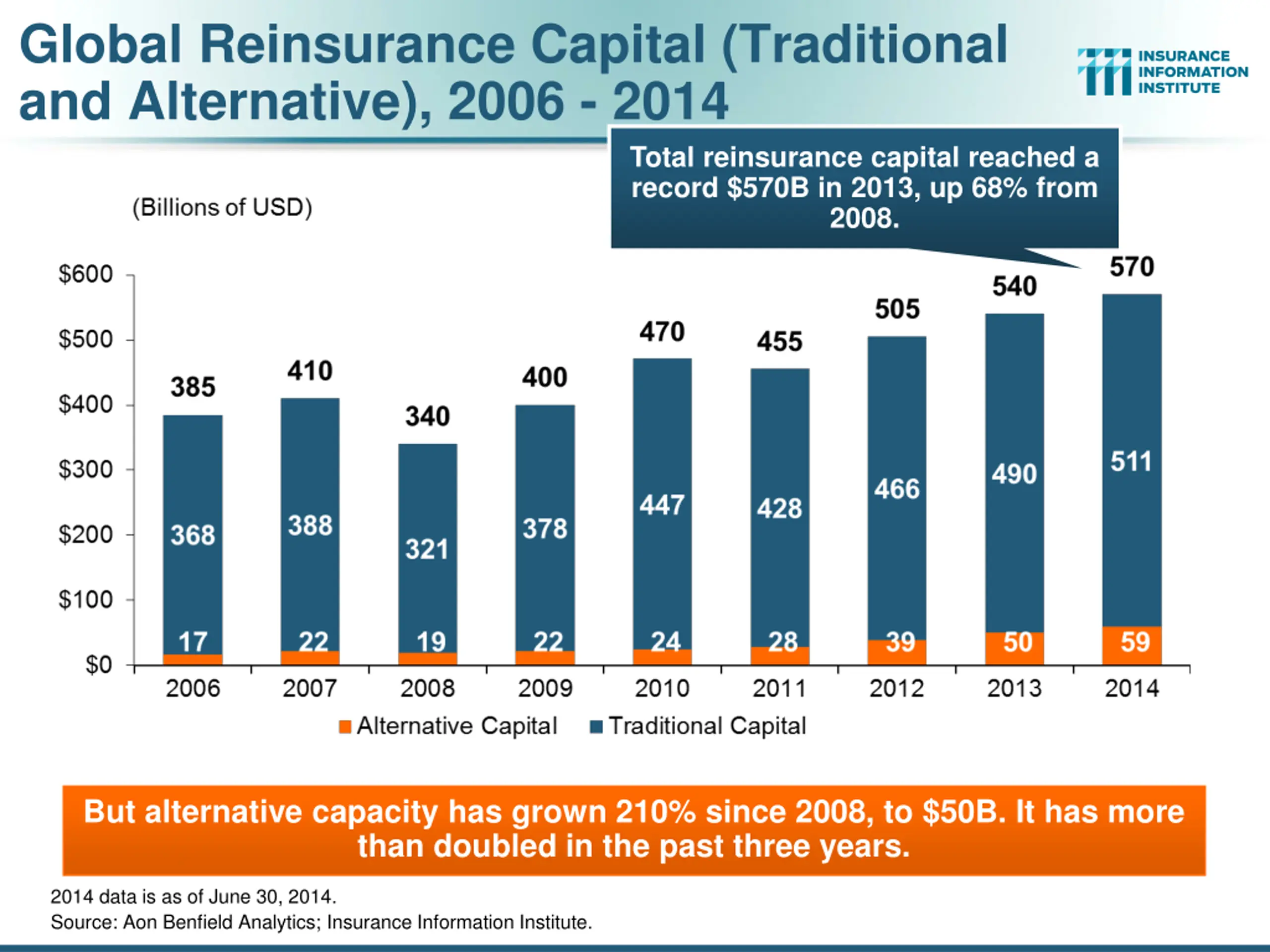 Global Reinsurance Capital (Traditional and Alternative), 2006 - 2014 Total reinsurance capital reached a record $570B in 2013, up 68% from 2008. But alternative capacity has grown 210% since 2008, to $50B. It has more than doubled in the past three years. 2014 data is as of June 30, 2014. Source: Aon Benfield Analytics; Insurance Information Institute.