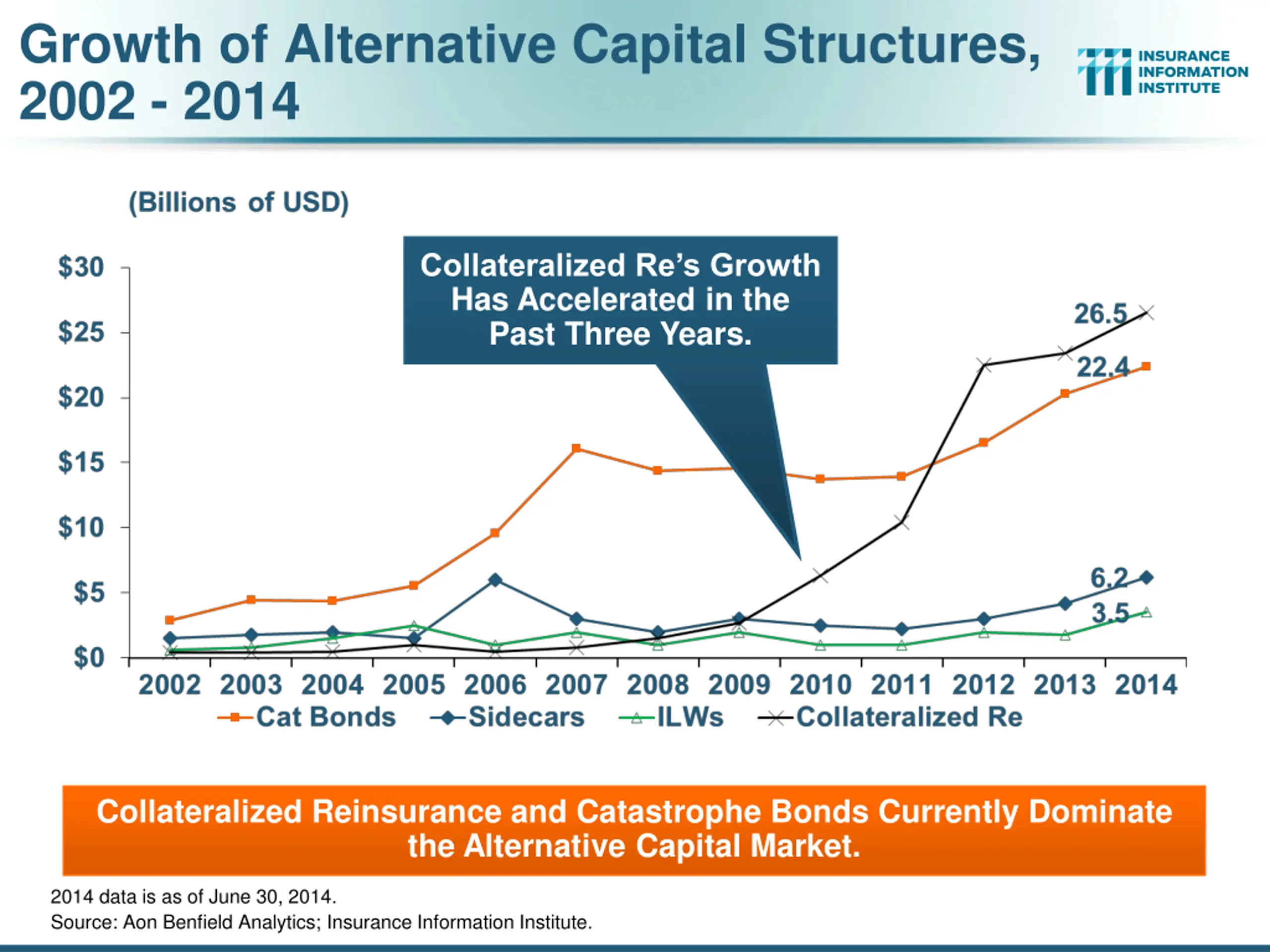 Growth of Alternative Capital Structures, 2002 - 2014 Collateralized Re s Growth Has Accelerated in the Past Three Years. Collateralized Reinsurance and Catastrophe Bonds Currently Dominate the Alternative Capital Market. 2014 data is as of June 30, 2014. Source: Aon Benfield Analytics; Insurance Information Institute.