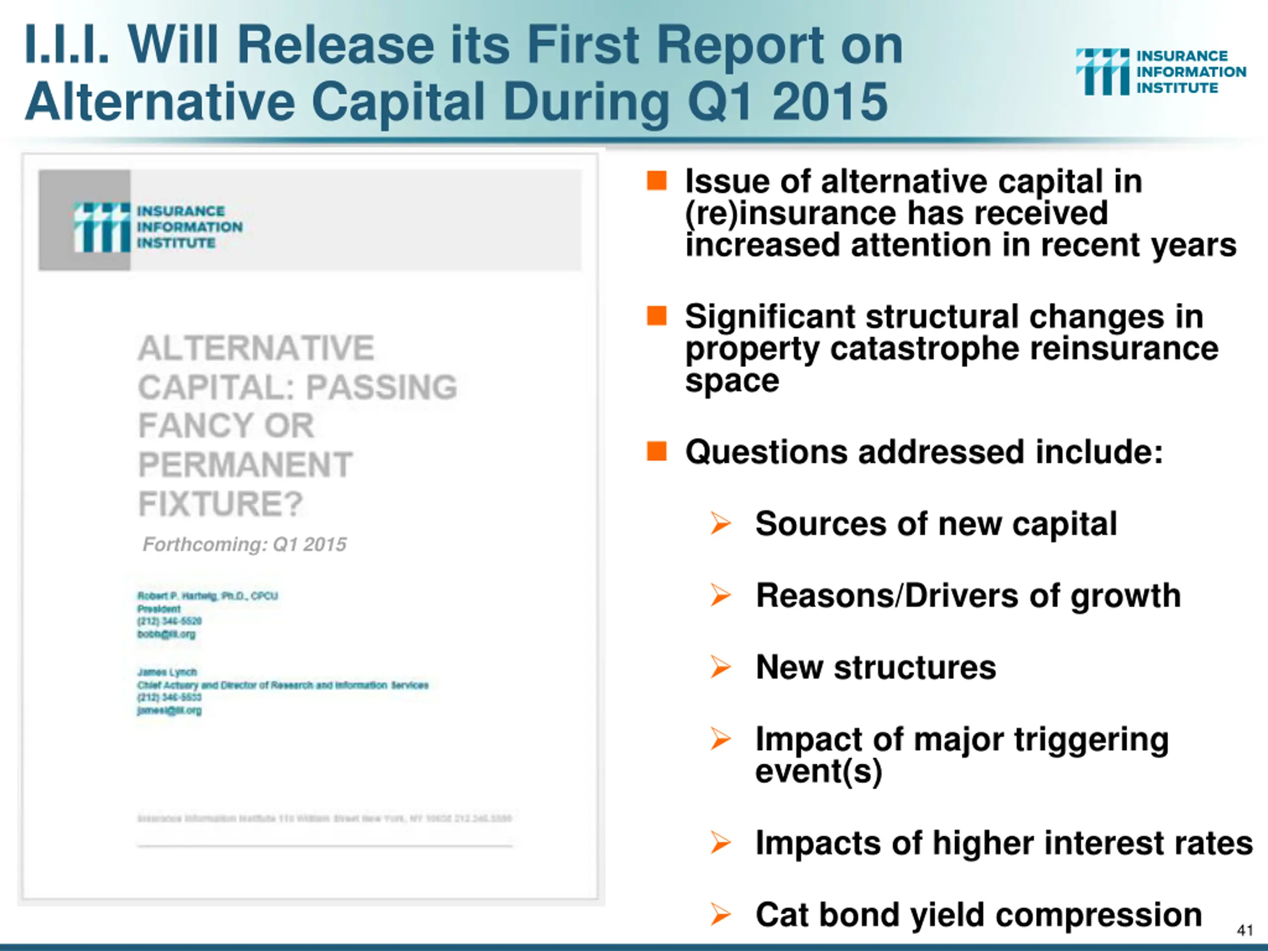 I.I.I. Will Release its First Report on Alternative Capital During Q1 2015 Issue of alternative capital in (re)insurance has received increased attention in recent years Significant structural changes in property catastrophe reinsurance space Questions addressed include: Sources of new capital Forthcoming: Q1 2015 Reasons/Drivers of growth New structures Impact of major triggering event(s) Impacts of higher interest rates Cat bond yield compression 41