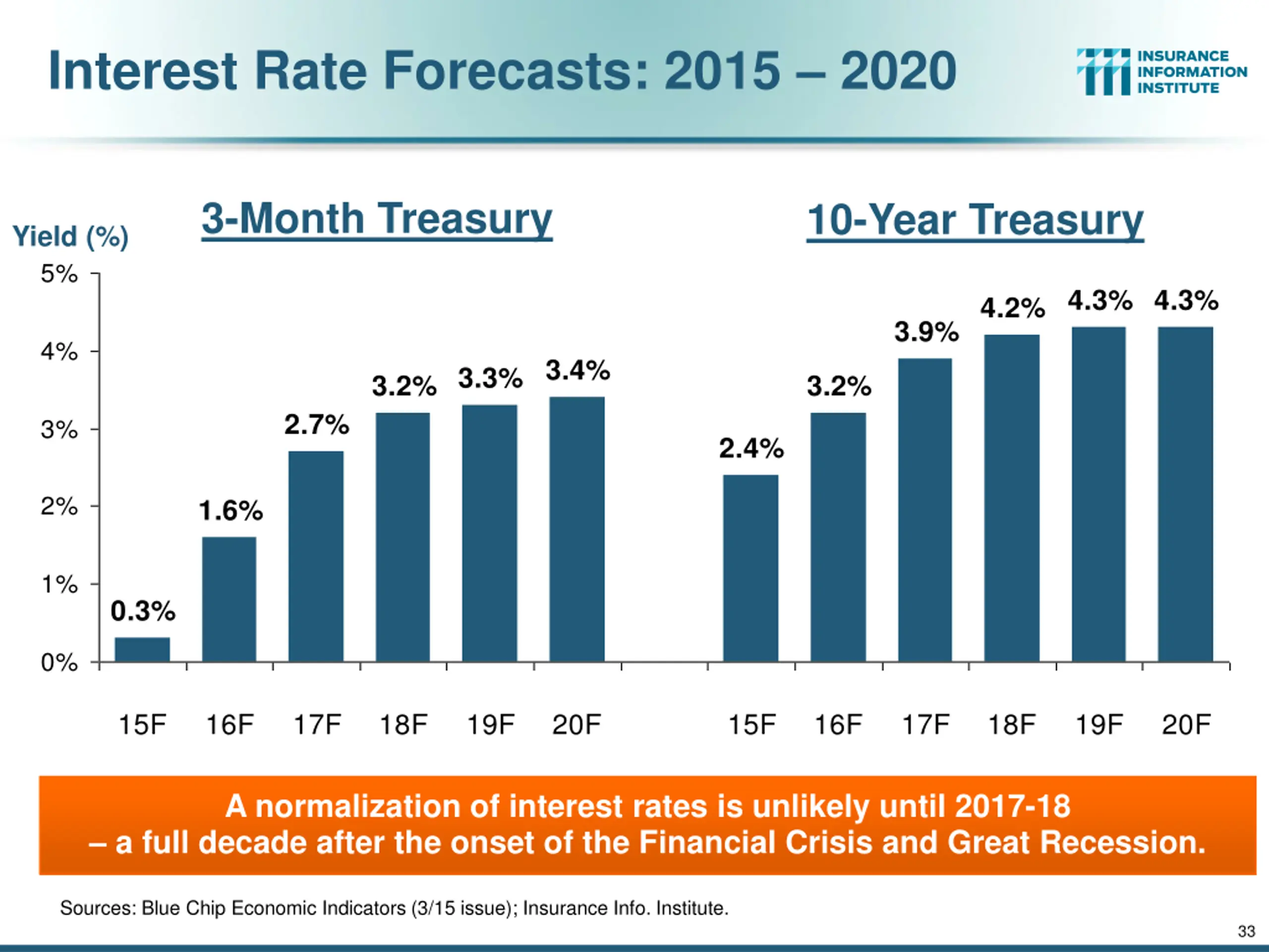 Interest Rate Forecasts: 2015 2020 3-Month Treasury 10-Year Treasury Yield (%) 5% 4.2%4.3% 4.3% 3.9% 4% 3.2%3.3%3.4% 3.2% 2.7% 3% 2.4% 2% 1.6% 1% 0.3% 0% 15F 16F 17F 18F 19F 20F 15F 16F 17F 18F 19F 20F A normalization of interest rates is unlikely until 2017-18 a full decade after the onset of the Financial Crisis and Great Recession. Sources: Blue Chip Economic Indicators (3/15 issue); Insurance Info. Institute. 33