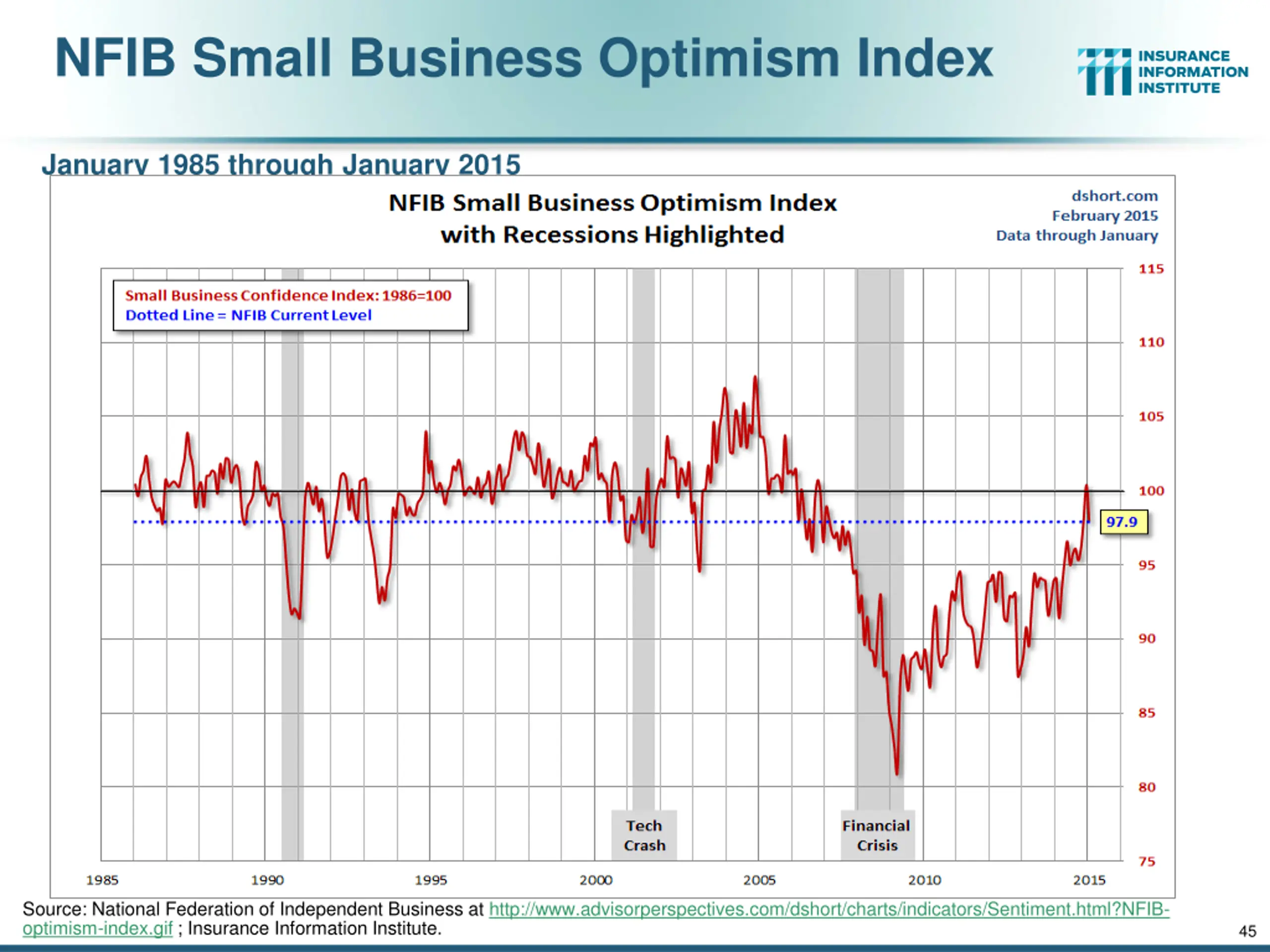 NFIB Small Business Optimism Index January 1985 through January 2015 Source: National Federation of Independent Business at http://www.advisorperspectives.com/dshort/charts/indicators/Sentiment.html?NFIB- optimism-index.gif ; Insurance Information Institute. 45