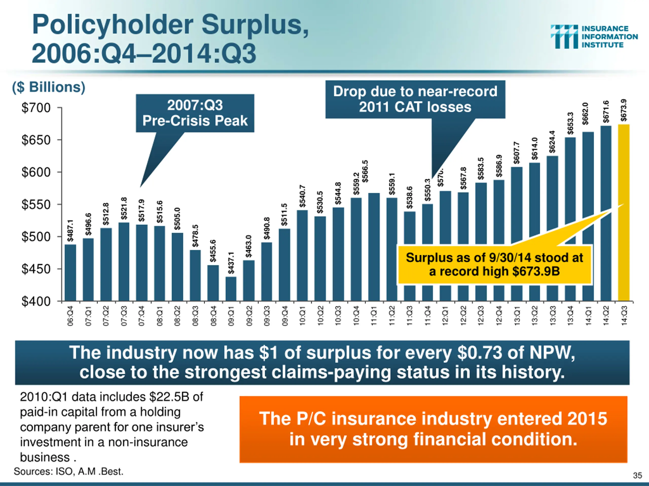 Premium-to-Surplus Ratio: 1985 2014* (Ratio of NWP to PHS) The larger surplus is in relation to premiums the lower the P:S ratio and the great the industry s capacity to handle the risk it has accepted $2.00 $1.75 Surplus as of 9/30/14 was $0.75:$1, a near-record low (at least in modern history) $1.50 $1.25 $1.00 9/11, Recession & Hard Market $0.75 $0.50 85 86 87 88 89 90 91 92 93 94 95 96 97 98 99 00 01 02 03 04 05 06 07 08 09 10 11 12 13 14* The Premium-to-Surplus Ratio Stood at $0.75:$1 as of 9/30/14, a Record Low (at Least in Recent History) * As of 9/30/14. Source: A.M. Best, ISO, Insurance Information Institute.