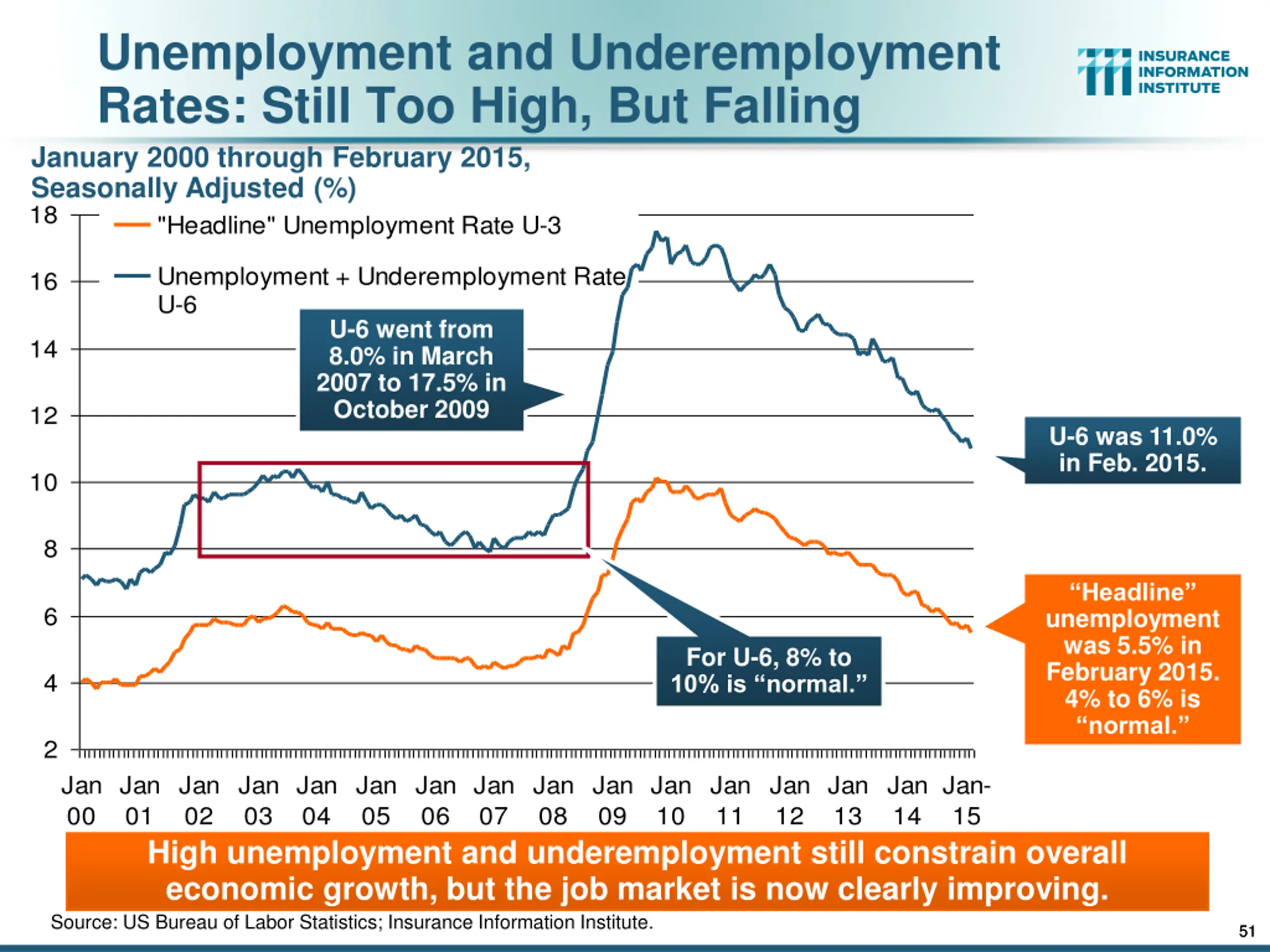 Monthly Change in Nonfarm Employment, 2011 2015* Average Monthly Gain Thousands 2011: 173,600 2012: 186,300 2013: 194,250 2014: 259,700 500 423 450 360 400 330 329 322 350 239295 286 280 274 300 250 249 243 237 236 226 225 225 221 221 217 214 213 212 250 203 203 149202 201 199 197 196 188 183 168 166 164 164 161 160 200 150 141 122 110 106 150 102 96 88 84 100 70 50 0 Jan-12 Jan-13 Jan-14 Jan-15 Jan-11 May-11 May-12 Mar-12 Mar-13 Mar-14 Mar-11 May 13 May 14 Jul-11 Jul-14 Jul-12 Jul-13 Sep-11 Sep-12 Sep-13 Sep-14 Nov-11 Nov-12 Nov-13 Nov-14 If job growth continues at the recent pace we will add over a million new workers every four months. *Seasonally adjusted. Jan 2015 and Feb 2015 are preliminary data. Sources: US Bureau of Labor Statistics; Insurance Information Institute 50