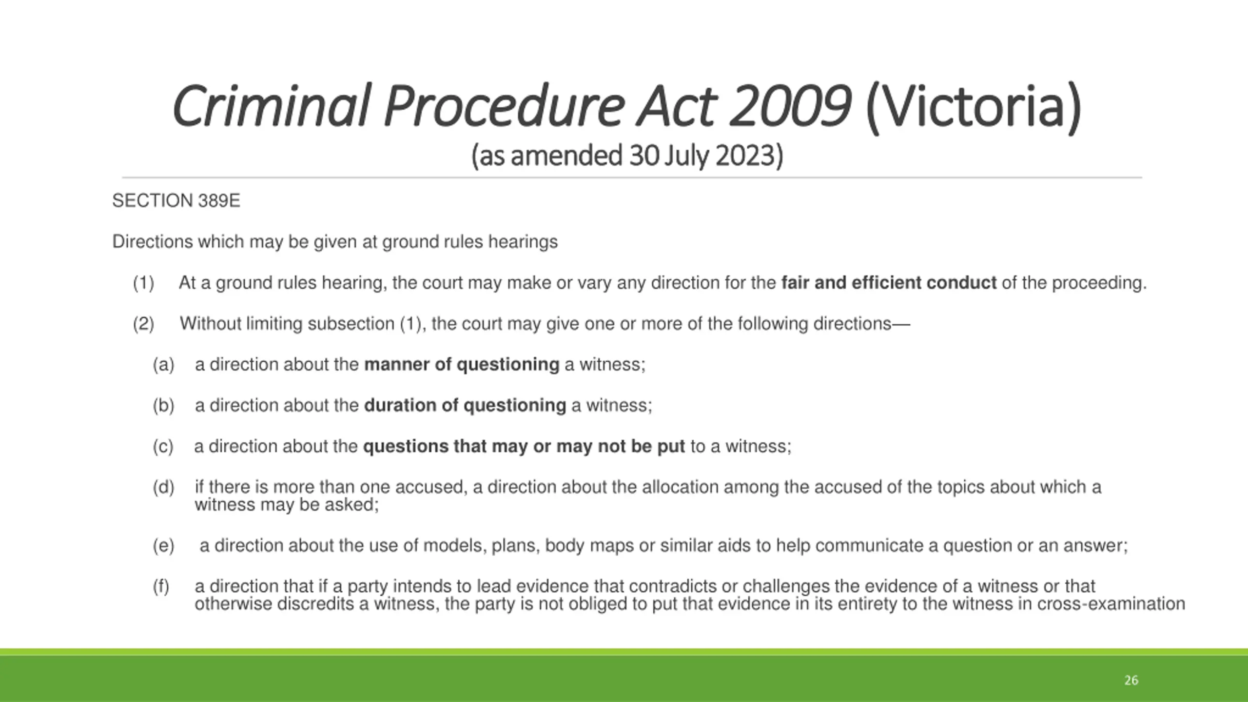 Criminal Procedure Act 2009 Criminal Procedure Act 2009 (Victoria) (as amended 30 July 2023) (as amended 30 July 2023) (Victoria) SECTION 389E Directions which may be given at ground rules hearings (1) At a ground rules hearing, the court may make or vary any direction for the fair and efficient conduct of the proceeding. (2) Without limiting subsection (1), the court may give one or more of the following directions (a) a direction about the manner of questioning a witness; (b) a direction about the duration of questioning a witness; (c) a direction about the questions that may or may not be put to a witness; (d) if there is more than one accused, a direction about the allocation among the accused of the topics about which a witness may be asked; (e) a direction about the use of models, plans, body maps or similar aids to help communicate a question or an answer; (f) a direction that if a party intends to lead evidence that contradicts or challenges the evidence of a witness or that otherwise discredits a witness, the party is not obliged to put that evidence in its entirety to the witness in cross-examination 26