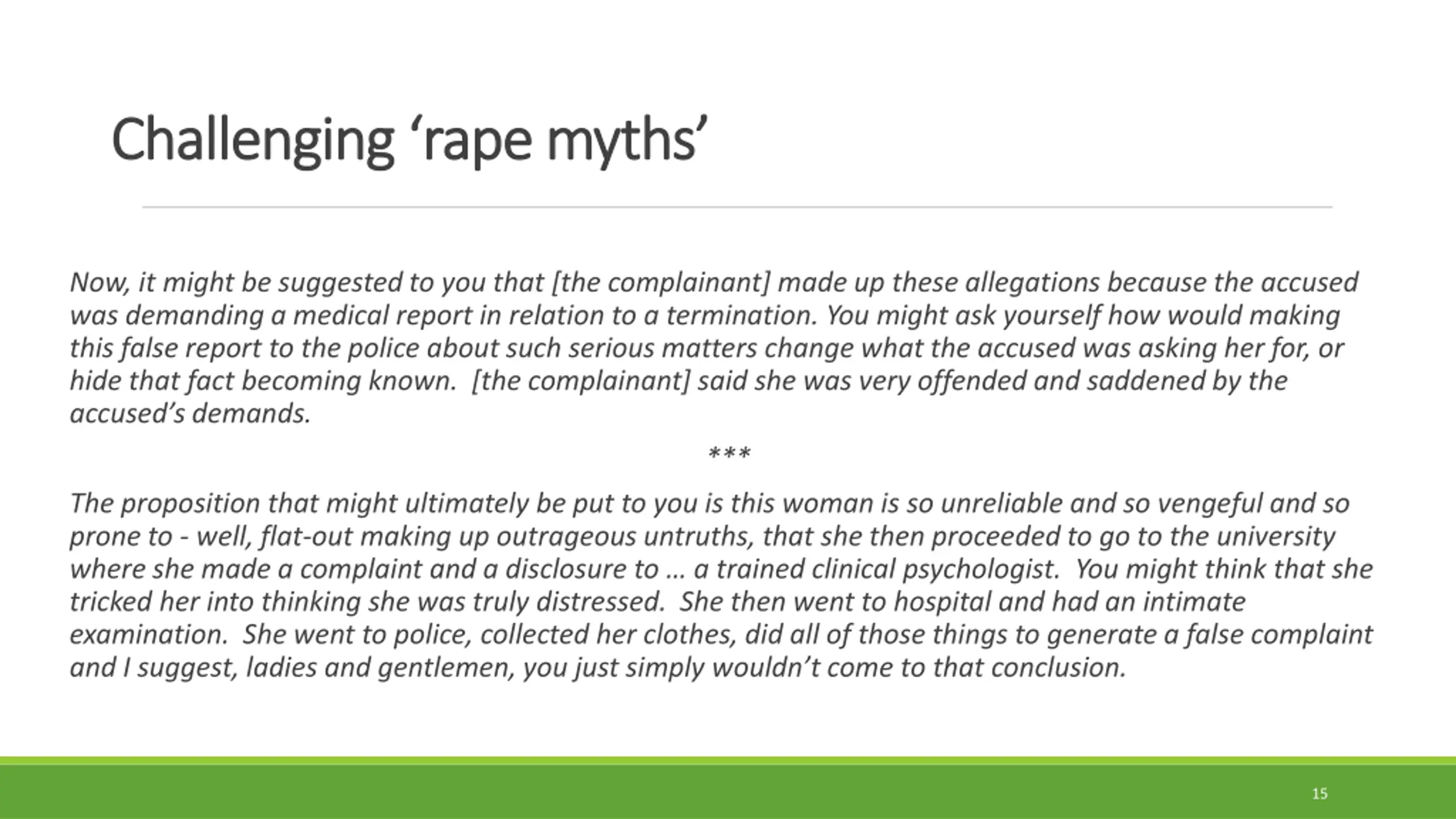 CROWN CASE Challenging rape Challenging rape m myths yths Now, it might be suggested to you that [the complainant] made up these allegations because the accused was demanding a medical report in relation to a termination. You might ask yourself how would making this false report to the police about such serious matters change what the accused was asking her for, or hide that fact becoming known. [the complainant] said she was very offended and saddened by the accused s demands. *** The proposition that might ultimately be put to you is this woman is so unreliable and so vengeful and so prone to - well, flat-out making up outrageous untruths, that she then proceeded to go to the university where she made a complaint and a disclosure to a trained clinical psychologist. You might think that she tricked her into thinking she was truly distressed. She then went to hospital and had an intimate examination. She went to police, collected her clothes, did all of those things to generate a false complaint and I suggest, ladies and gentlemen, you just simply wouldn t come to that conclusion. 15