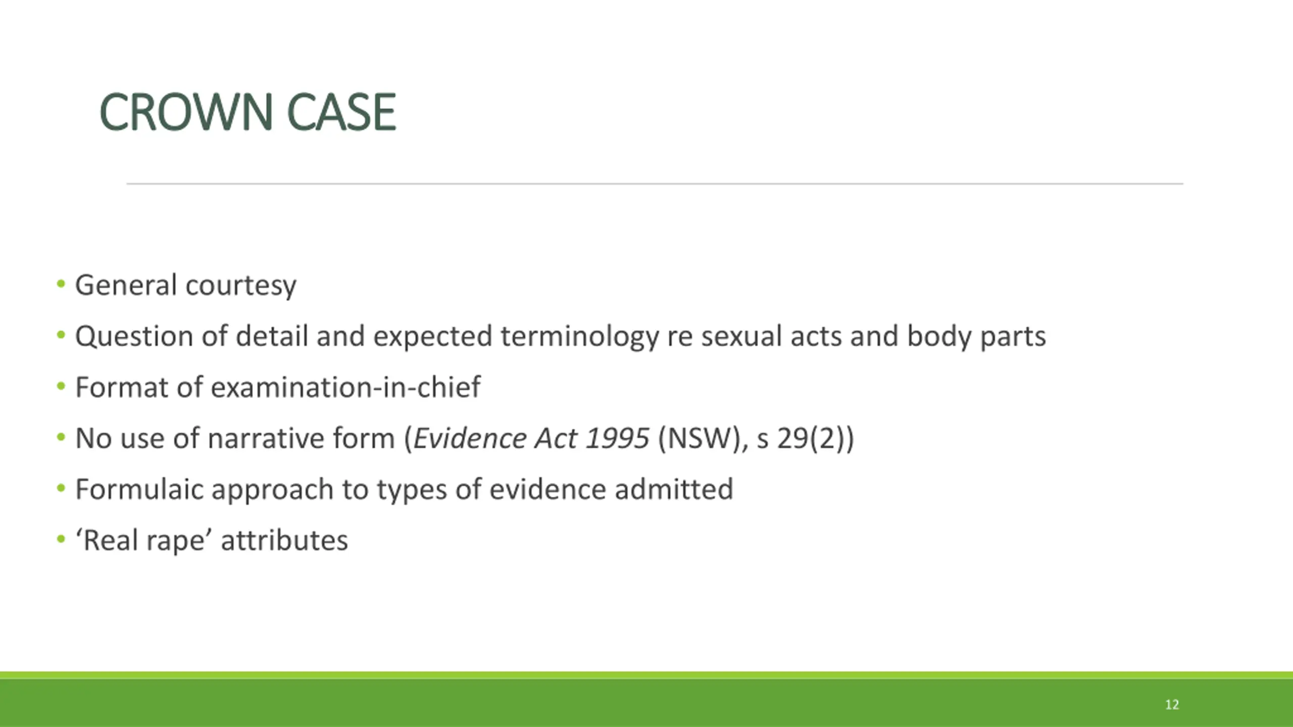 CROWN CASE CROWN CASE General courtesy Question of detail and expected terminology re sexual acts and body parts Format of examination-in-chief No use of narrative form (Evidence Act 1995 (NSW), s 29(2)) Formulaic approach to types of evidence admitted Real rape attributes 12