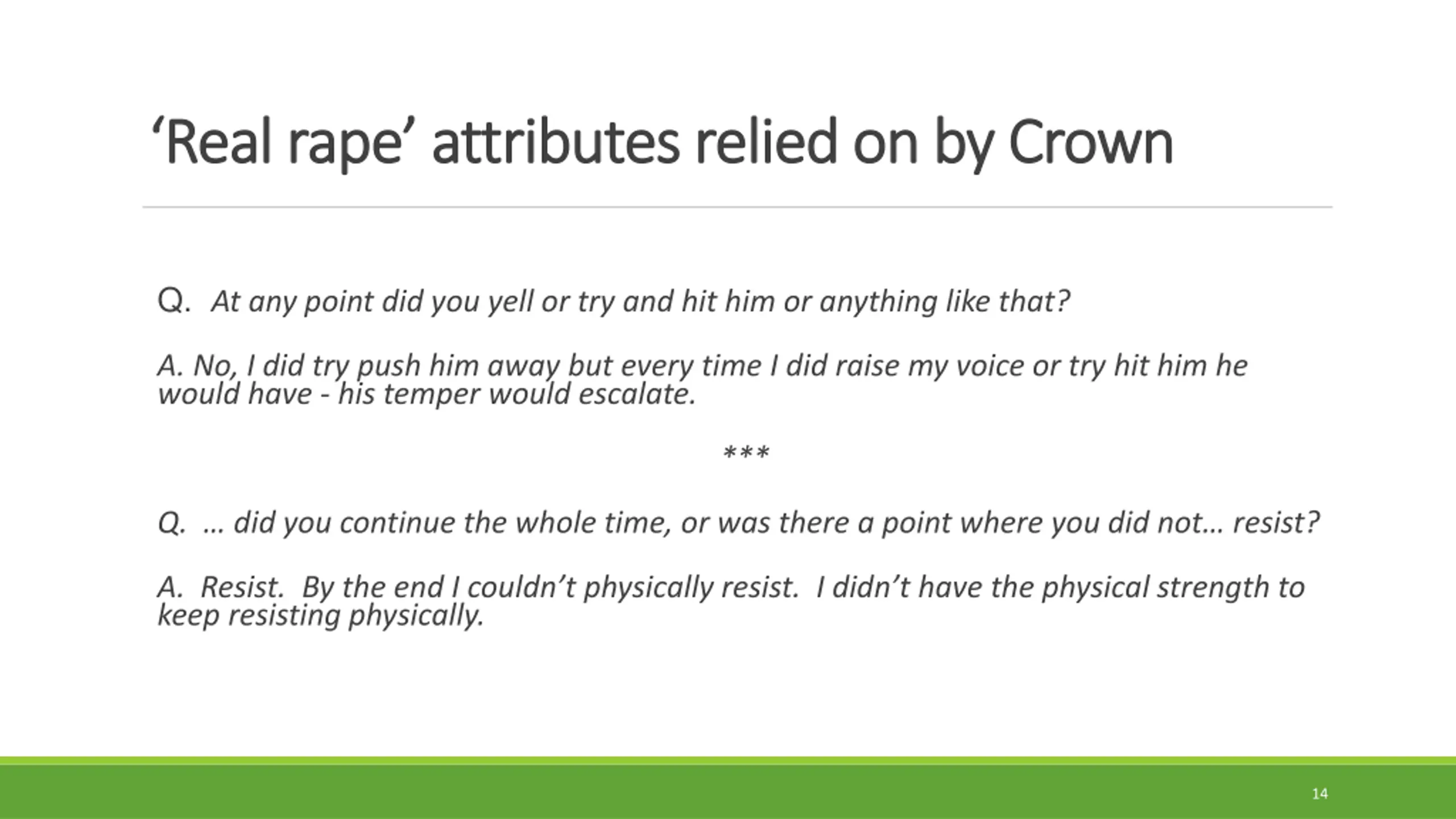 CROWN CASE CROWN CASE Real rape attributes relied on by Crown Real rape attributes relied on by Crown Q. At any point did you yell or try and hit him or anything like that? A. No, I did try push him away but every time I did raise my voice or try hit him he would have - his temper would escalate. *** Q. did you continue the whole time, or was there a point where you did not resist? A. Resist. By the end I couldn t physically resist. I didn t have the physical strength to keep resisting physically.resisting physically. 14
