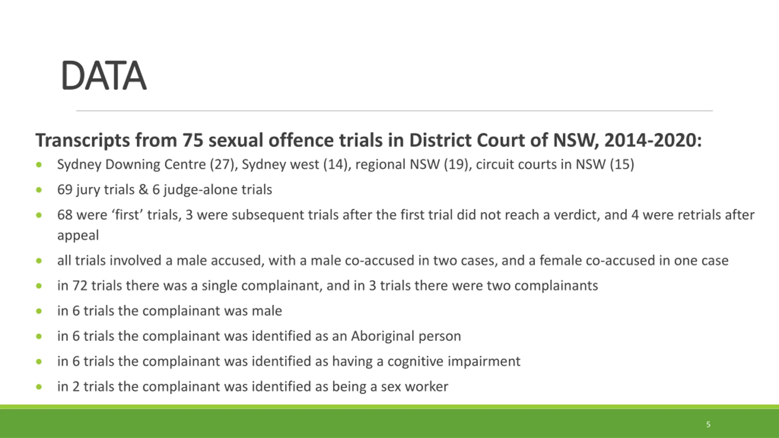 DATA DATA Transcripts from 75 sexual offence trials in District Court of NSW, 2014-2020: Sydney Downing Centre (27), Sydney west (14), regional NSW (19), circuit courts in NSW (15) 69 jury trials & 6 judge-alone trials 68 were first trials, 3 were subsequent trials after the first trial did not reach a verdict, and 4 were retrials after appeal all trials involved a male accused, with a male co-accused in two cases, and a female co-accused in one case in 72 trials there was a single complainant, and in 3 trials there were two complainants in 6 trials the complainant was male in 6 trials the complainant was identified as an Aboriginal person in 6 trials the complainant was identified as having a cognitive impairment in 2 trials the complainant was identified as being a sex worker 5