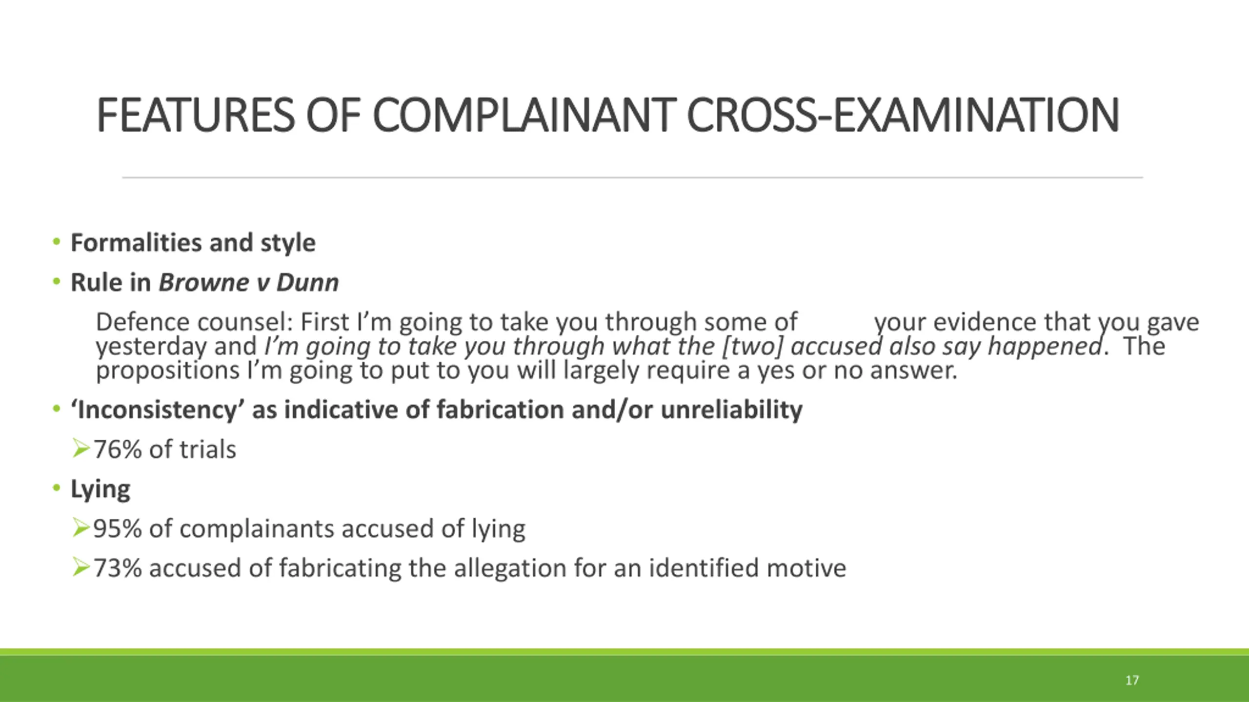FEATURES OF COMPLAINANT CROSS FEATURES OF COMPLAINANT CROSS- -EXAMINATION EXAMINATION Formalities and style Rule in Browne v Dunn Defence counsel: First I m going to take you through some of yesterday and I m going to take you through what the [two] accused also say happened. The propositions I m going to put to you will largely require a yes or no answer. Inconsistency as indicative of fabrication and/or unreliability 76% of trials Lying 95% of complainants accused of lying 73% accused of fabricating the allegation for an identified motive your evidence that you gave 17
